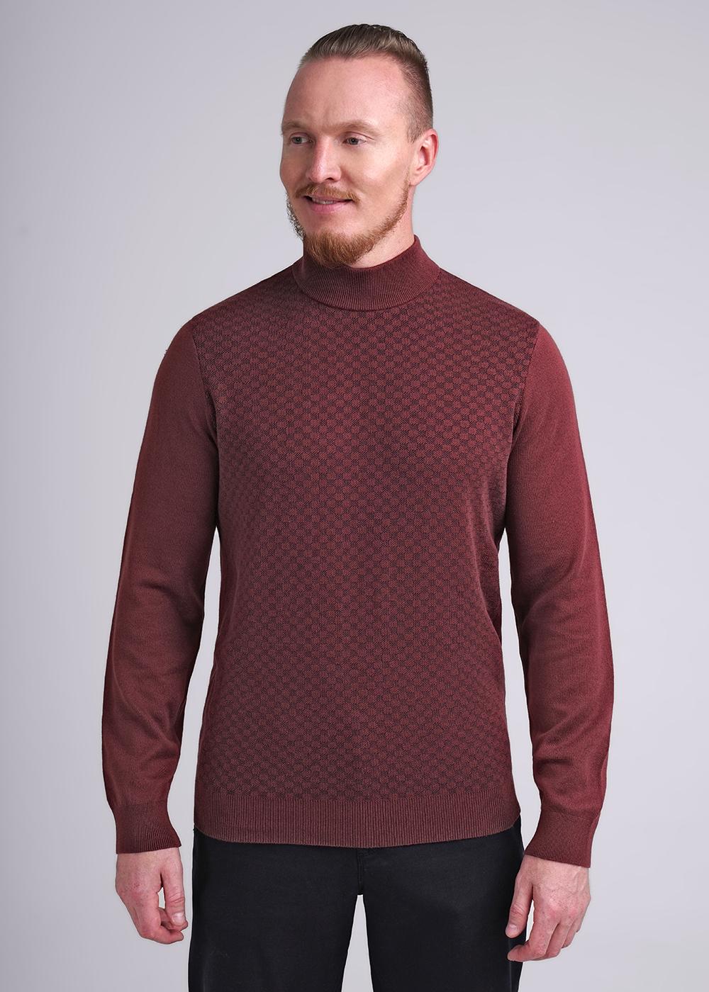Мужская водолазка с воротником-стойкой и длинным рукавом. Выполнена из смесовой пряжи с большим содержанием хлопка. Модель с геометрическим орнаментом по переду, подходит для формальных и повседневных встреч.