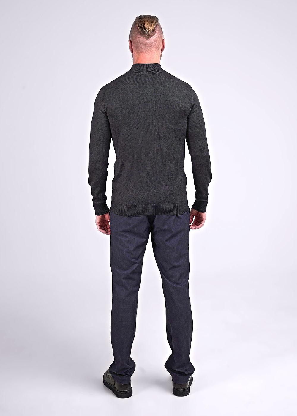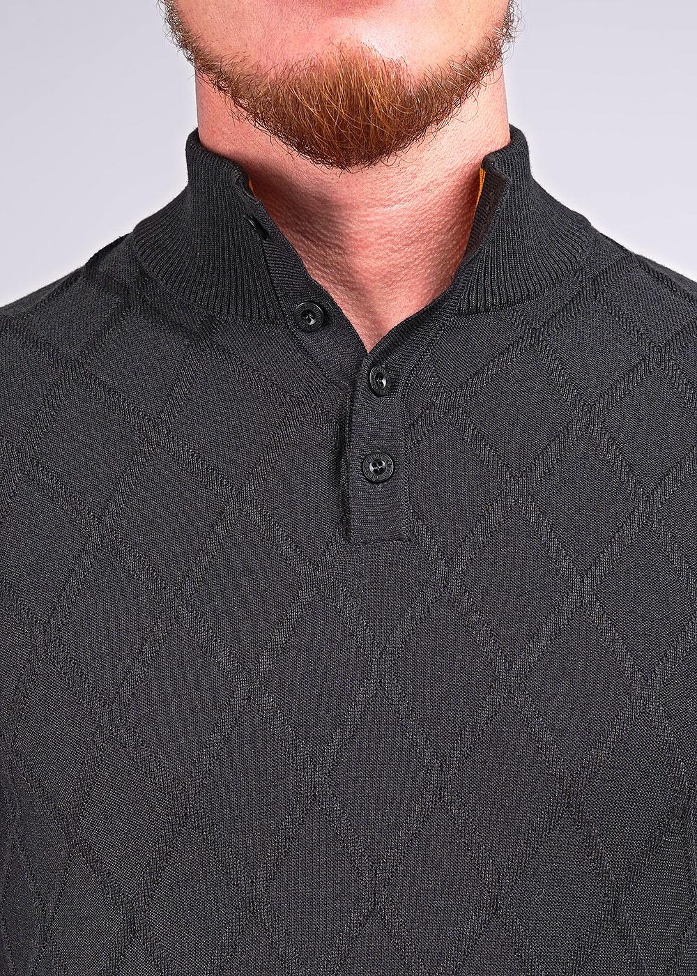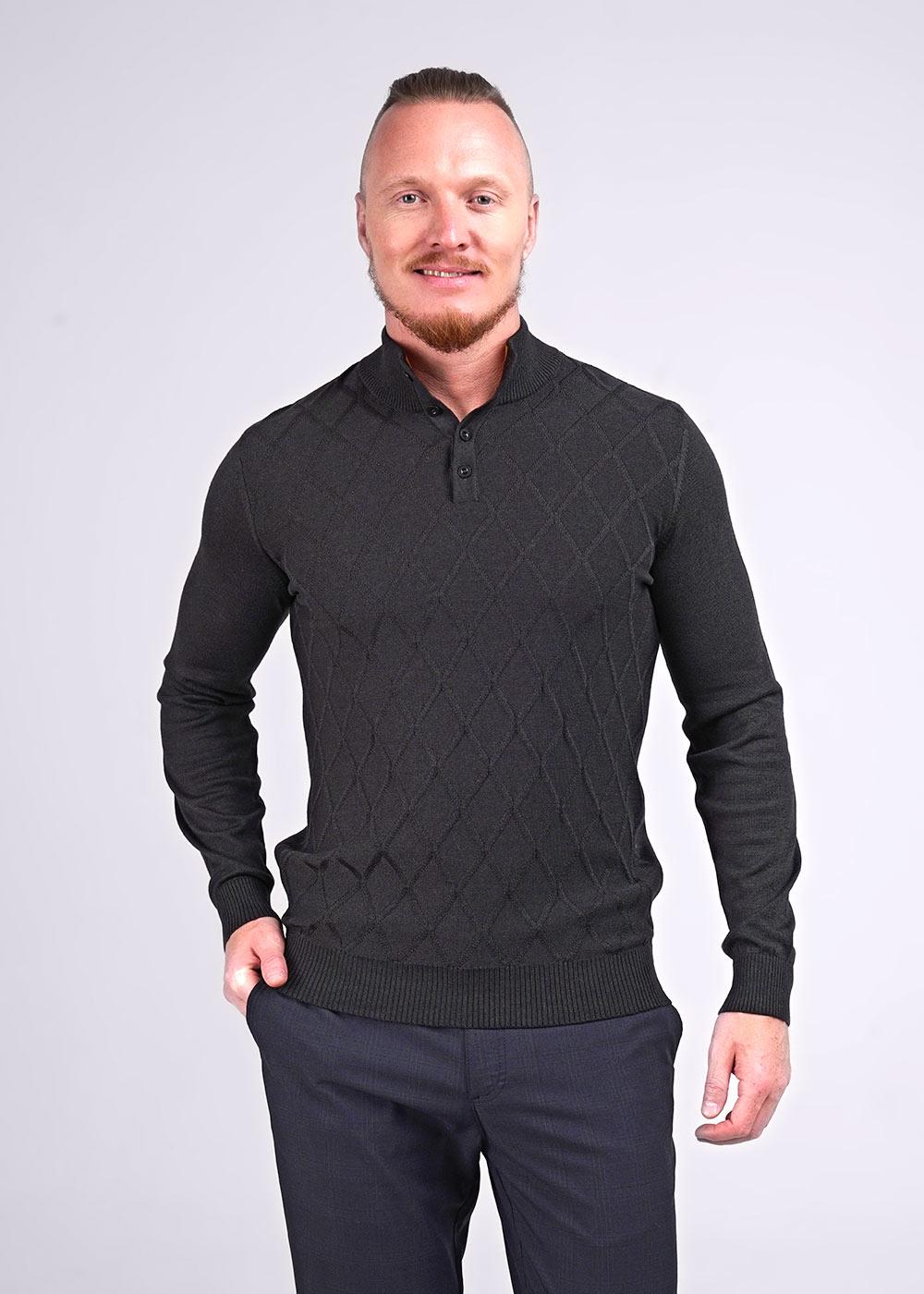 Мужской джемпер с воротником стойка на пуговицах, с длинным рукавом. Модель связана из приятной хлопковой пряжи с добавлением акрила с вывязанным геометрическим рисунком по полочке. Изделие можно сочетать как в классическом стиле, так и в повседневном.