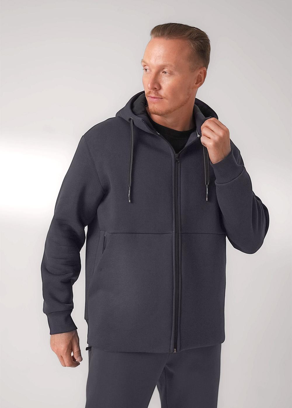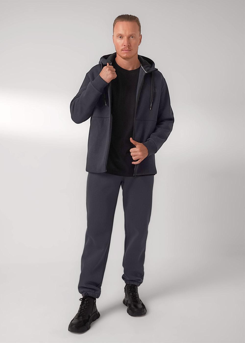 Тёплая мужская трикотажная куртка на молнии с капюшоном и вместительными карманами. Произведена из мягкого трикотажного футер с начёсом, дополнена дизайнерским принтом. Удобный и практичный вариант на каждый день.