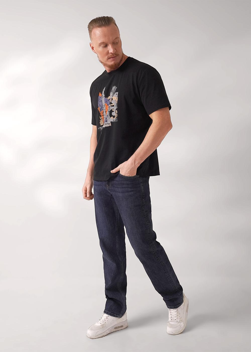 Футболка увеличенного объёма с круглой горловиной из хлопкового полотна. Изделие дополнено имиджевым принтом. Данная модель прекрасно впишется в любой гардероб и составит образ с брюками или джинсами.