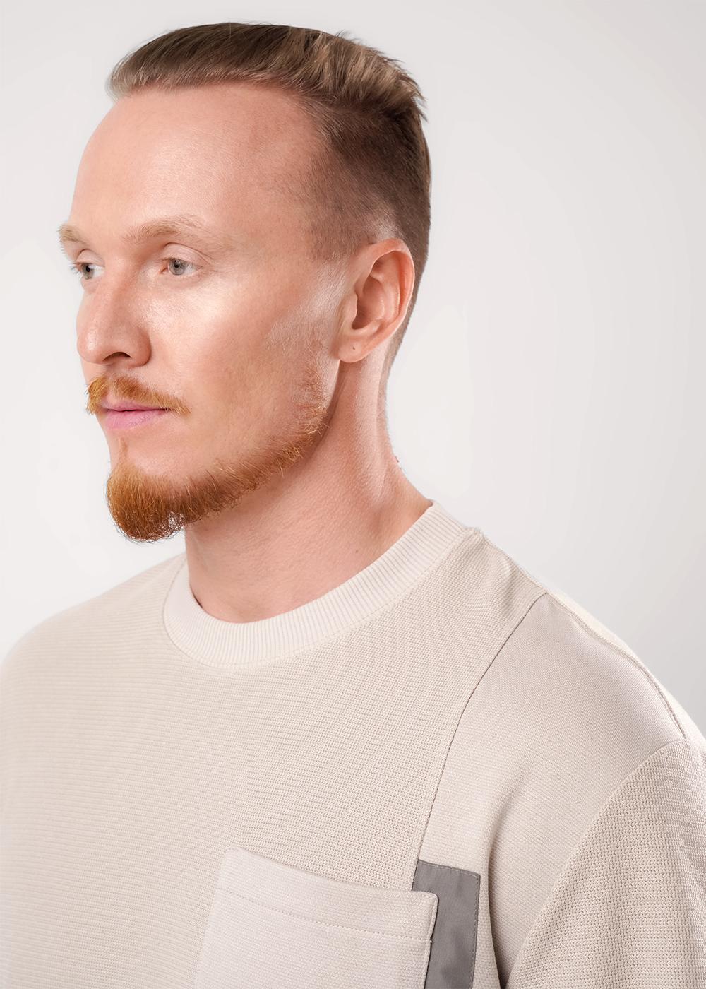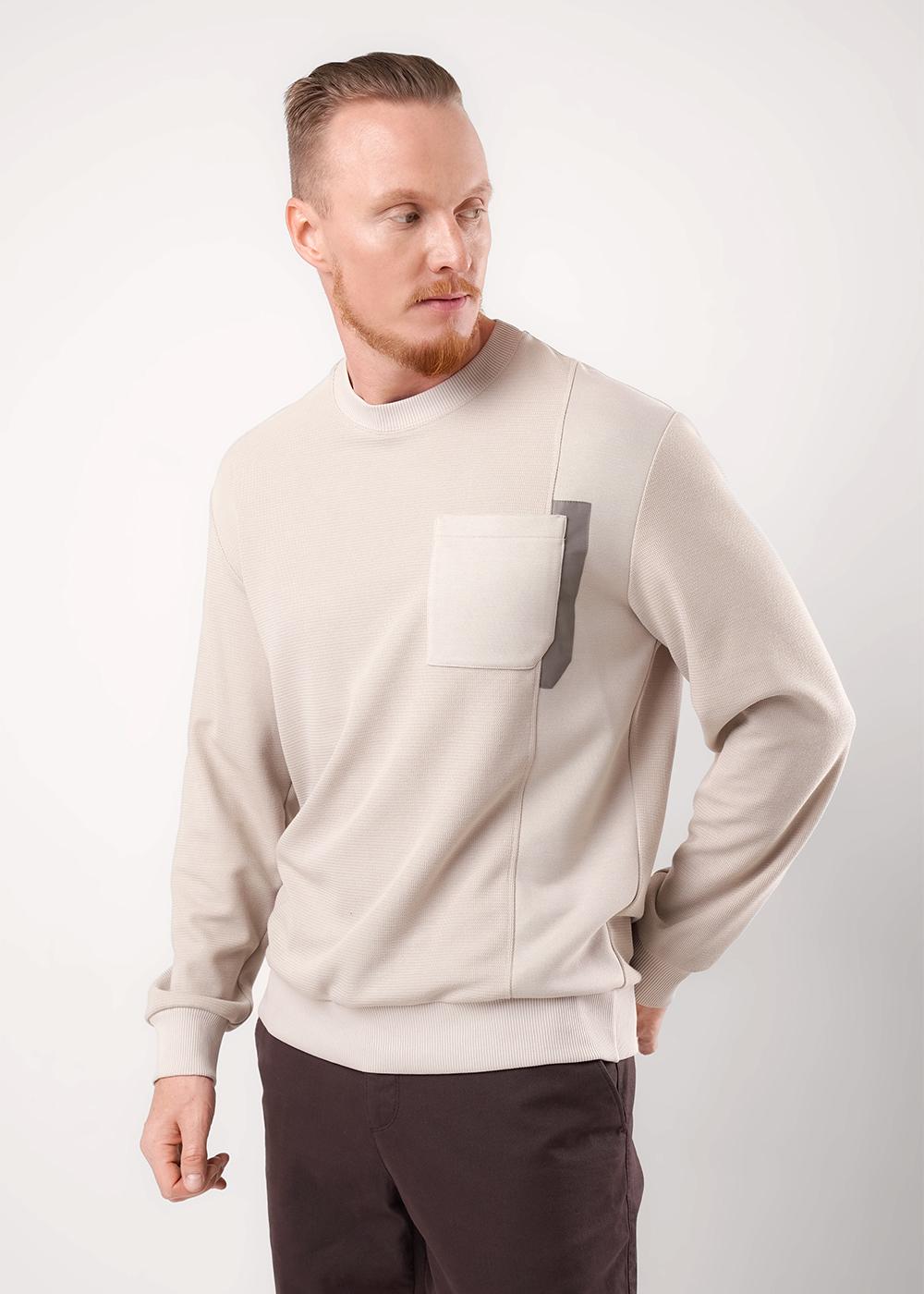 Стильный мужской комбинированный джемпер из трикотажного фактурного полотна. Изделие с круглым вырезом горловины и длинным рукавом на манжете. Модель дополняется нагрудным карманом. Отличный вариант на каждый день и встреч с друзьями.