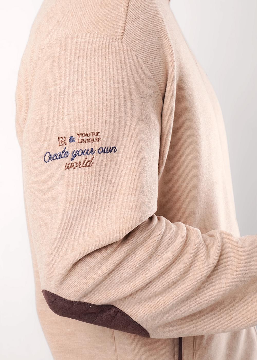 Мужская куртка на стойке с застежкой на молнию. Изделие выполнено из трикотажного полотна с мягкой бархатистой лицевой стороной. Модель дополнена вышивкой, налокотниками и вязаными отделками. Прекрасно подойдёт для прогулок и встреч с друзьями.