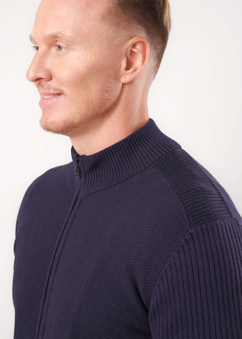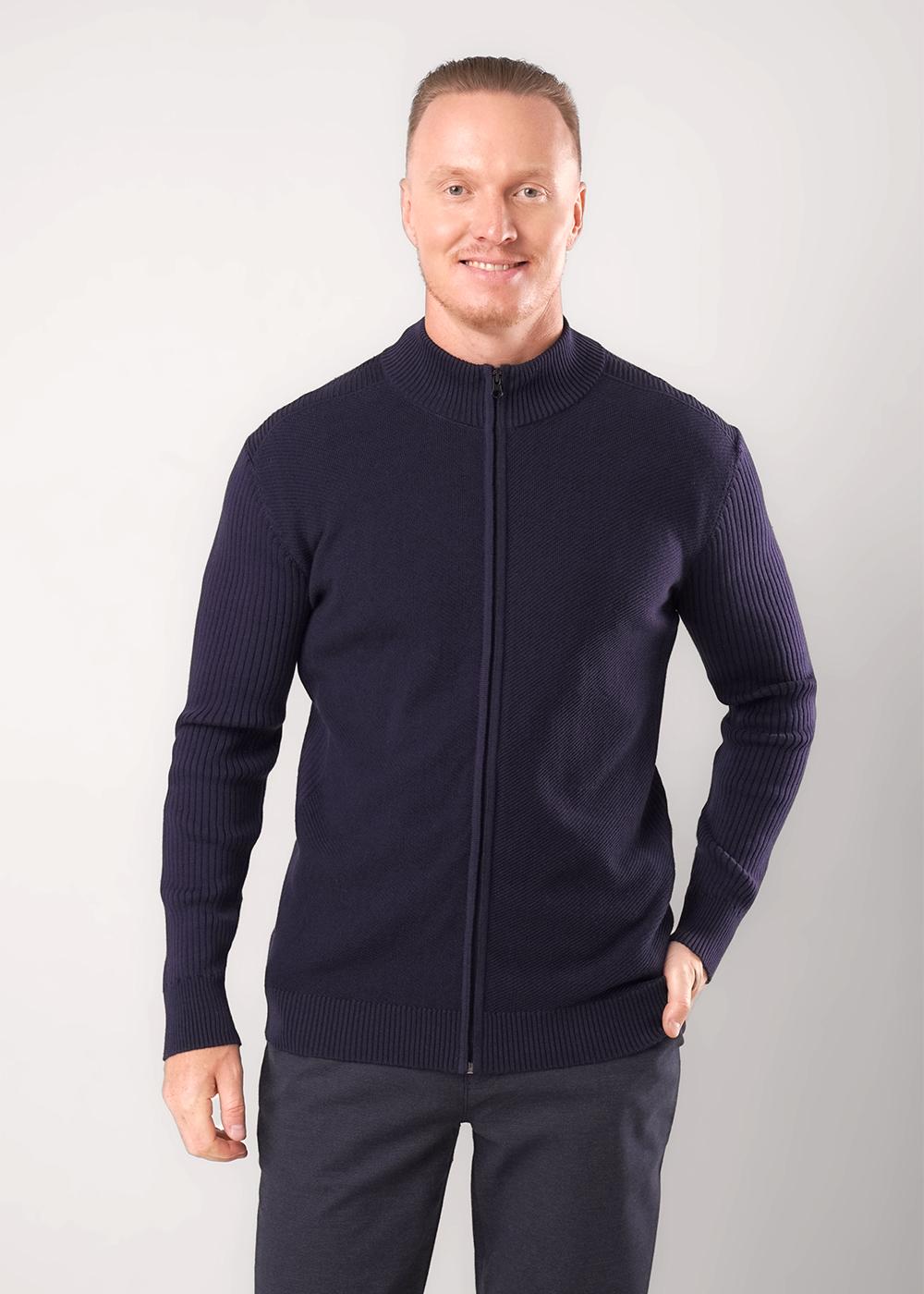 Мужской джемпер на молнии с высоким воротником-стойкой. Лаконичный дизайн подчеркивается фактурной вязкой. Прямой крой, эластичные манжеты и широкий пояс обеспечивают удобную посадку и комфорт в повседневной носке.