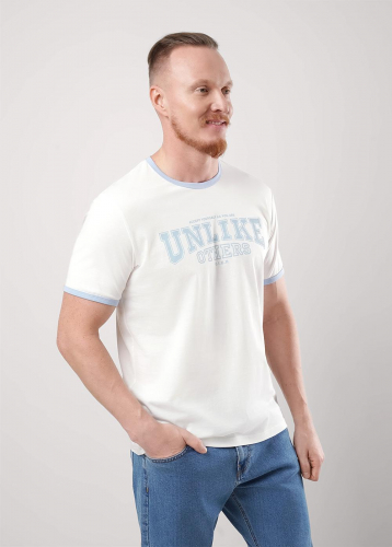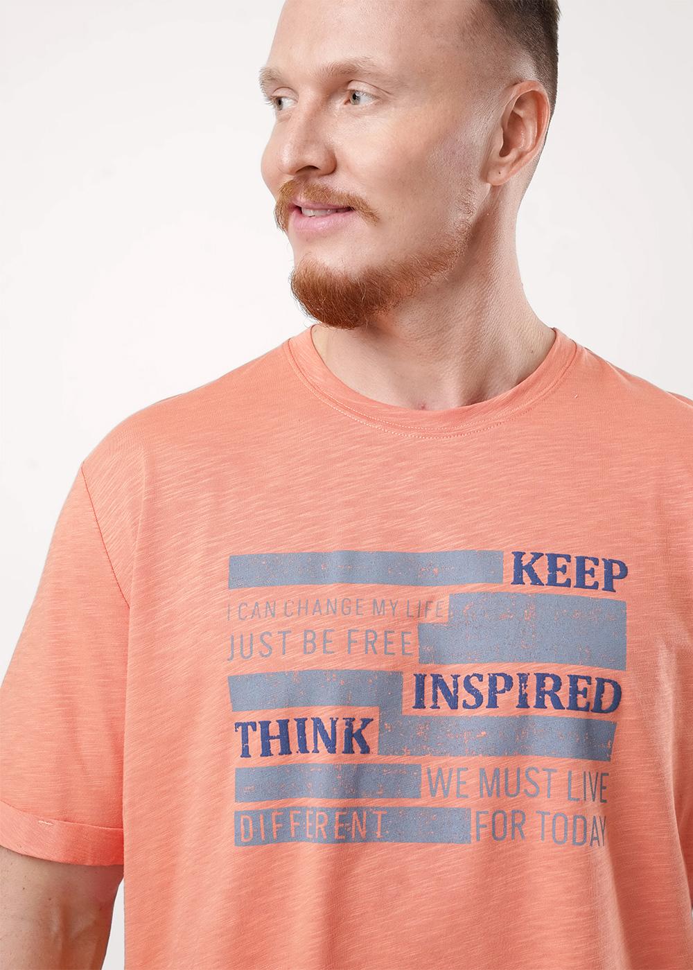 Футболка мужская с круглым вырезом горловины и коротким втачным рукавом из фактурного полотна флам. Футболку дополняет шрифтовой принт. Подойдет для прогулок и встреч с друзьями.
