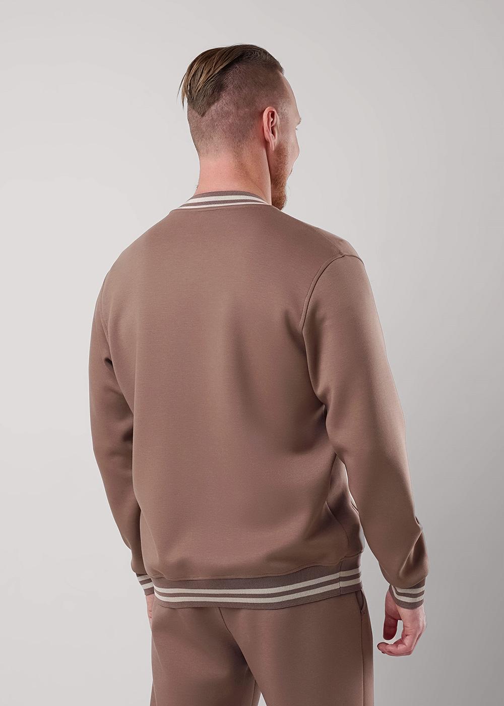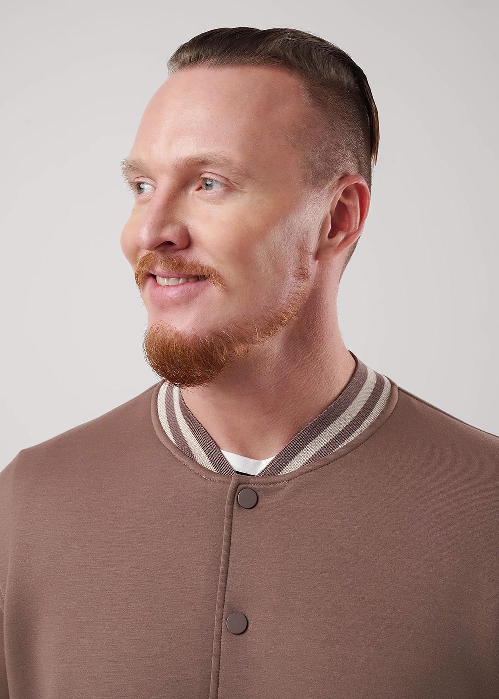 Мужской бомбер на кнопках из трикотажного полотна. Особенностью изделия являются вязаные отделки, в виде воротника, пояса и манжет. Стильное решение для повседневного образа.