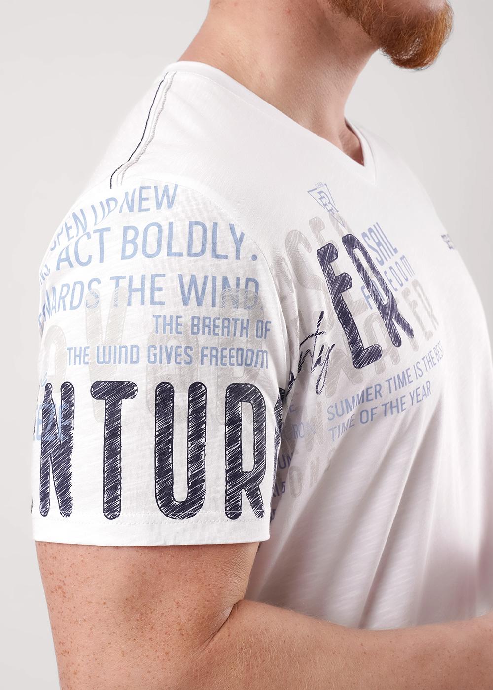 Футболка мужская с V-образным вырезом горловины и коротким втачным рукавом из фактурного полотна "флам". Данная модель дополнена контрастными отделочными строчками по боковым швам и шрифтовыми принтами. Можно сочетать с брюками или шортами.