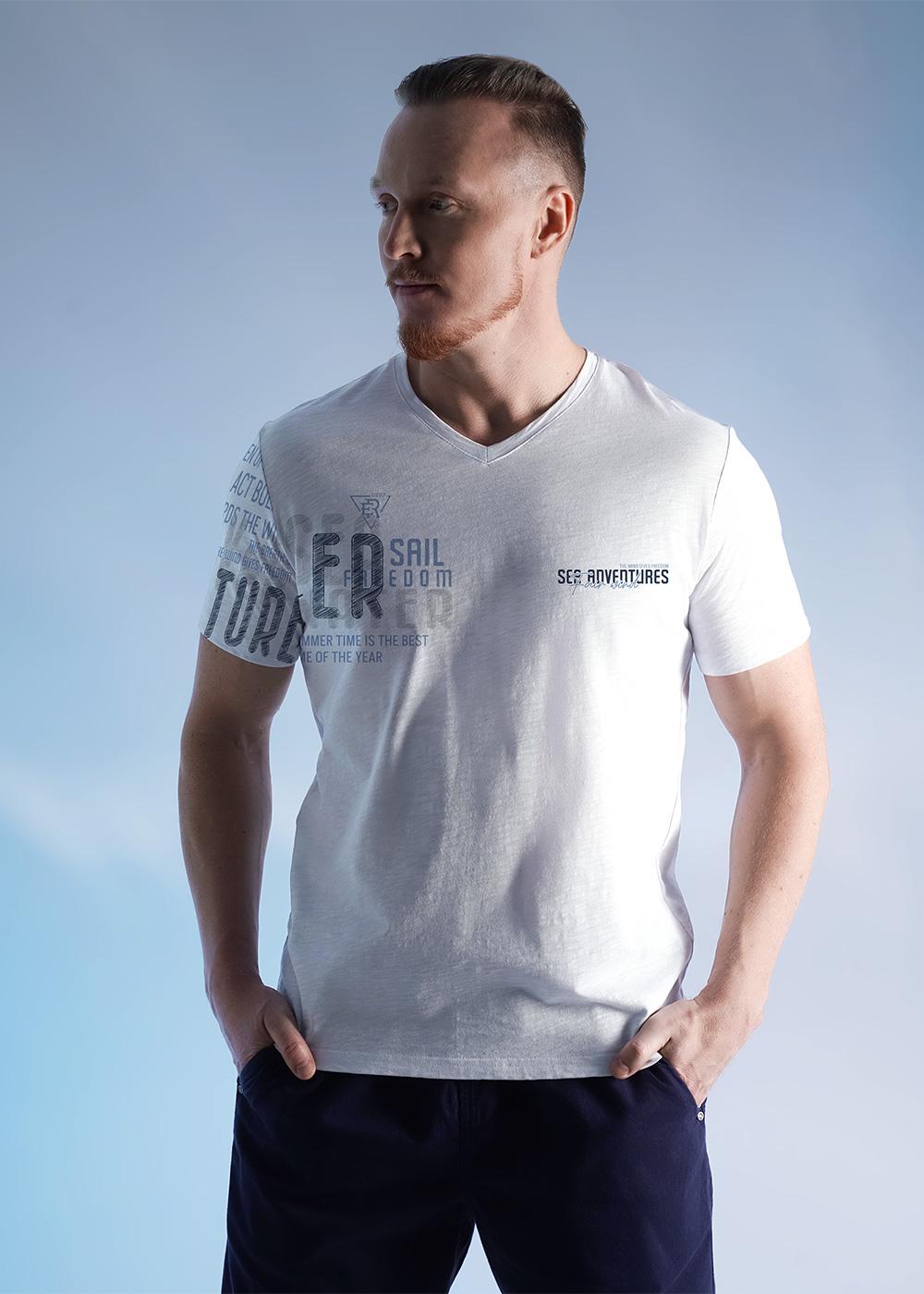 Футболка мужская с V-образным вырезом горловины и коротким втачным рукавом из фактурного полотна "флам". Данная модель дополнена контрастными отделочными строчками по боковым швам и шрифтовыми принтами. Можно сочетать с брюками или шортами.