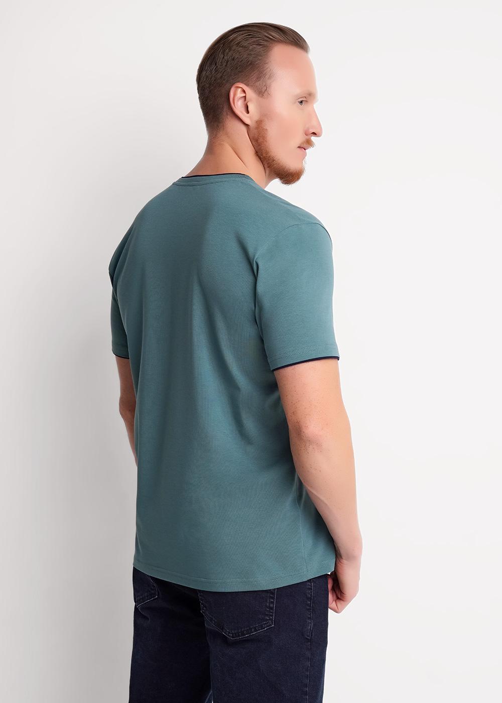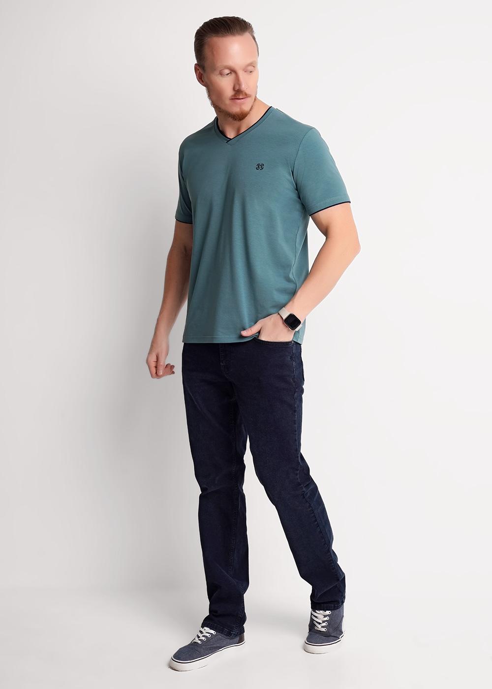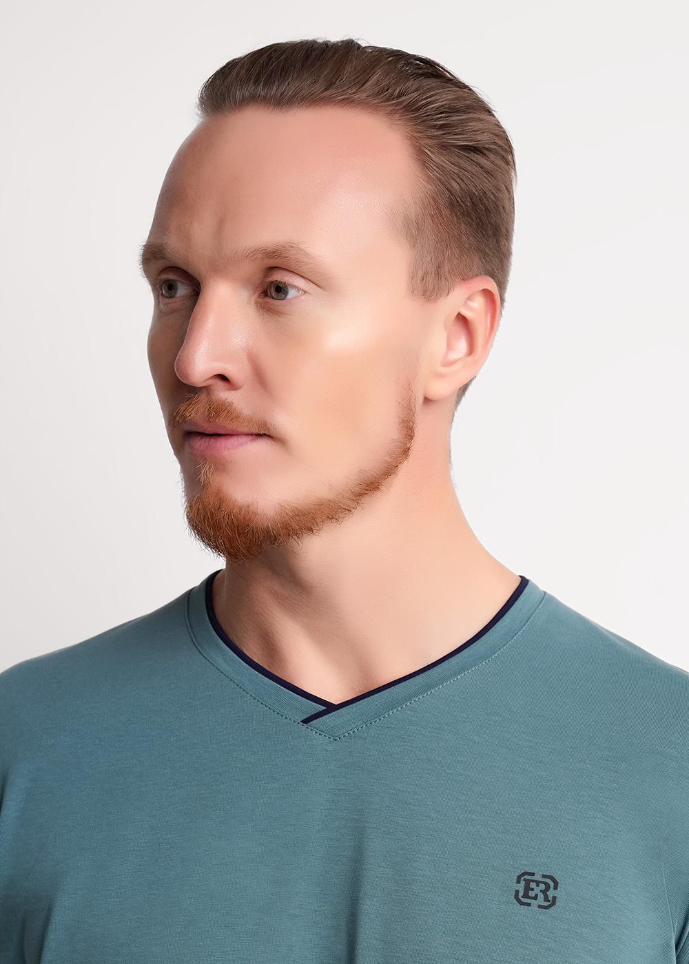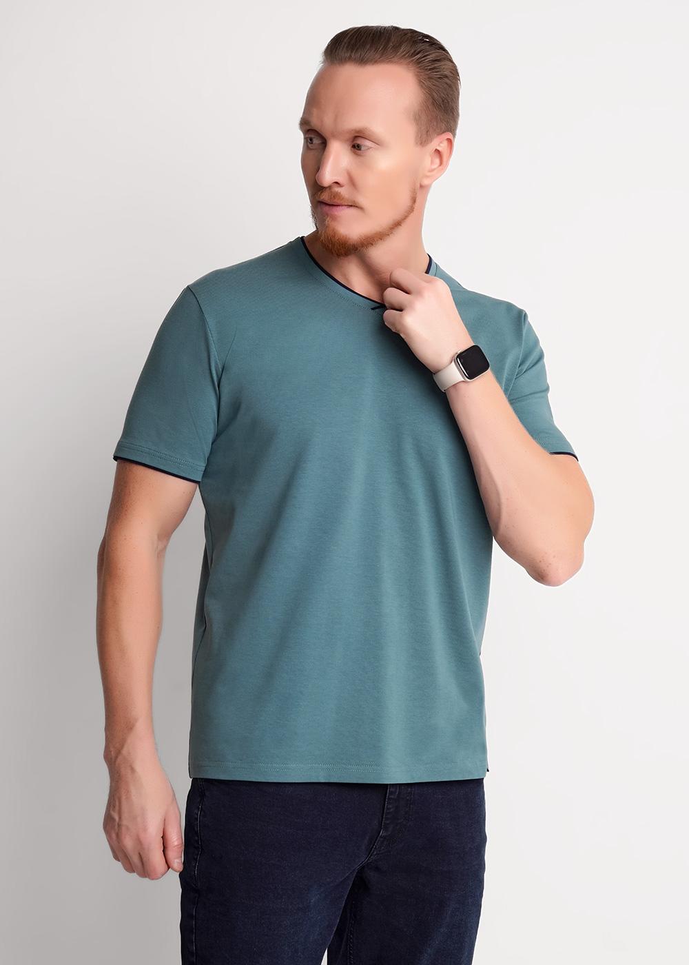 Мужская футболка из трикотажного полотна. Изделие с V-образным вырезом горловины и коротким втачным рукавом. Футболка отличается за счет контрастных вставок по горловине и манжету, фирменным принтом.