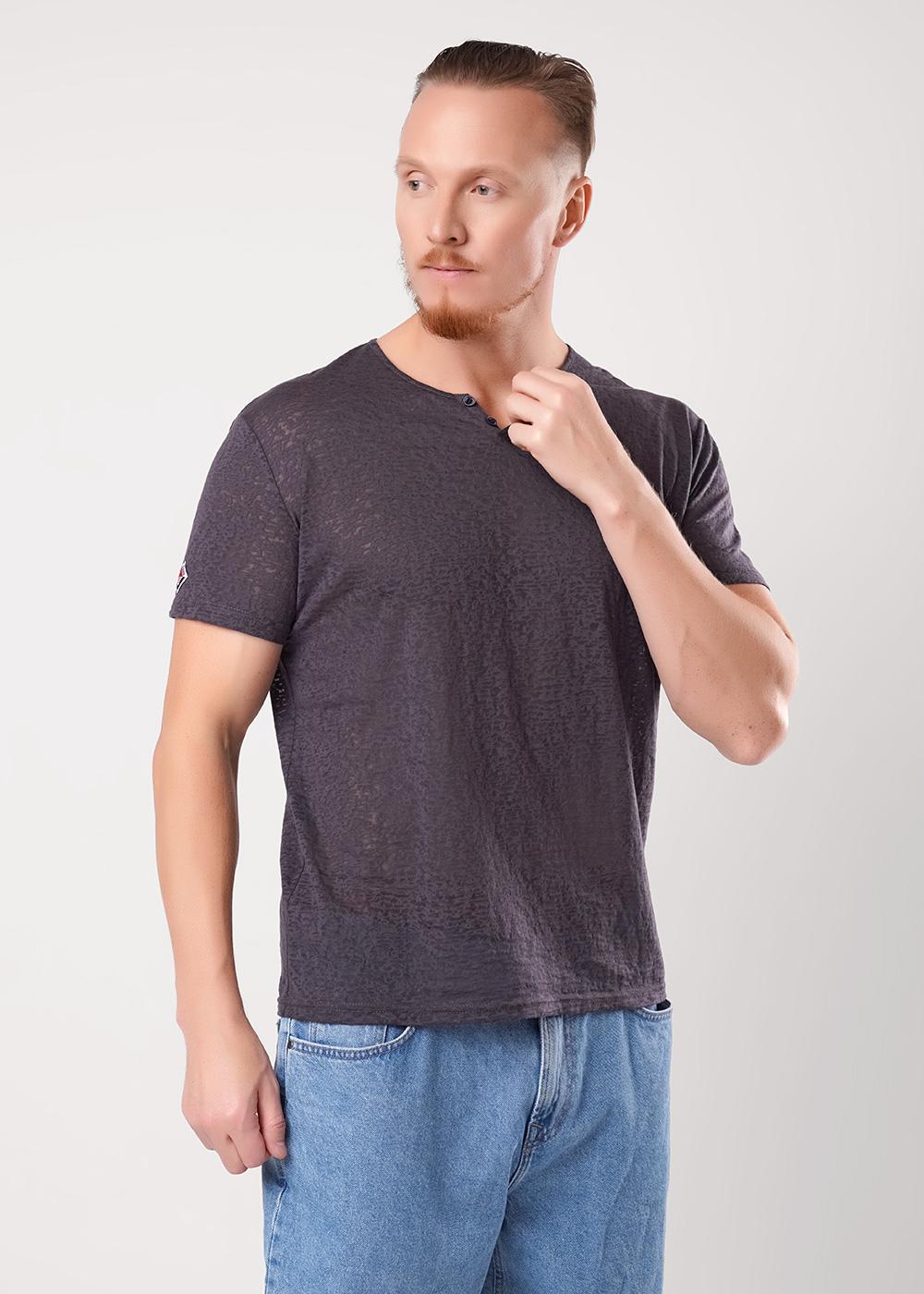 Футболка мужская с круглым вырезом горловины и декоративной планкой с пуговицами, с коротким втачным рукавом. Модель дополнена имиджевой фурнитурой, что делает образ стильным и завершенным.