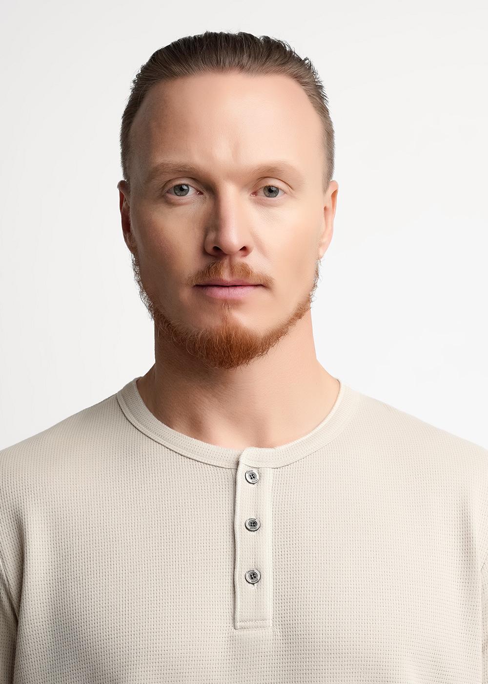 Футболка-поло с воротником-стойка и функциональной планкой на пуговицах, из трикотажного полотна "вафля". Изделие дополнено имиджевой фурнитурой и отделочными строчками. Простая и удобная модель, идеально подходящая для повседневного гардероба.