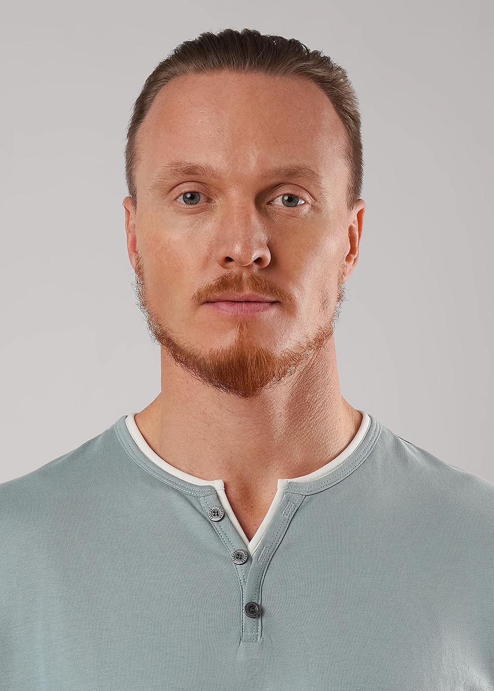 Футболка из трикотажного плотного хлопкового полотна с воротником-стойка и декоративной планкой на пуговицах. Модель дополнена имиджевой фурнитурой. Отличный вариант на каждый день.