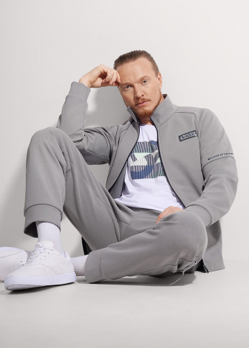 Куртка мужская, спортивная, с воротником стойкой и застежкой на молнии, выполнена из плотного трикотажного полотна. Модель дополнена дизайнерским принтом и имиджевой фурнитурой. Практичный вариант на каждый день.