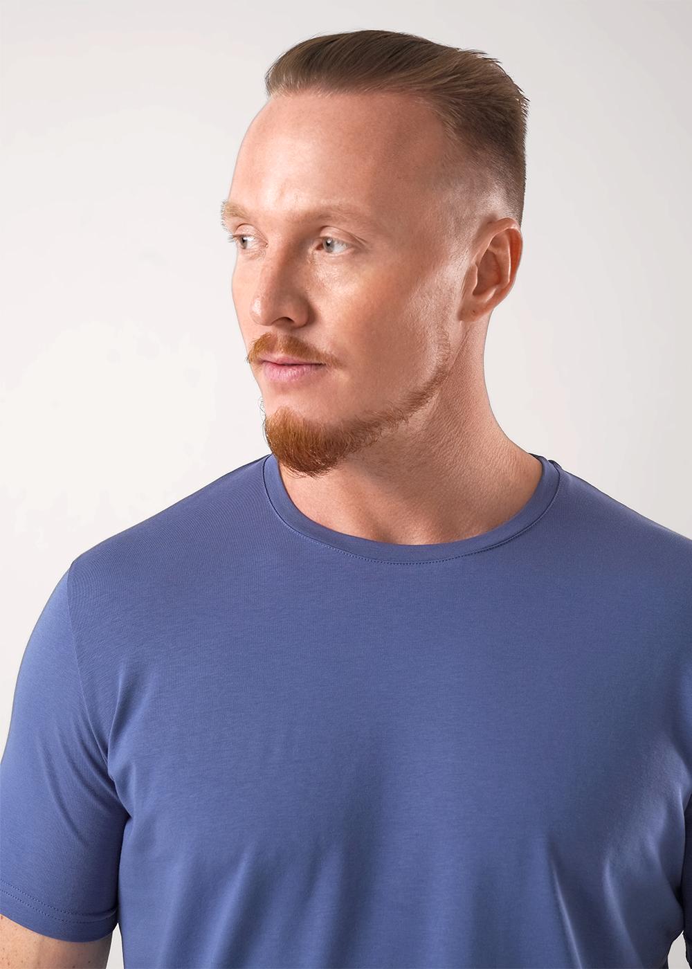 Базовая однотонная футболка стандартного объема с круглой горловиной, втачным рукавом из хлопкового полотна с добавлением эластана. Является неотъемлемой частью мужского гардероба.