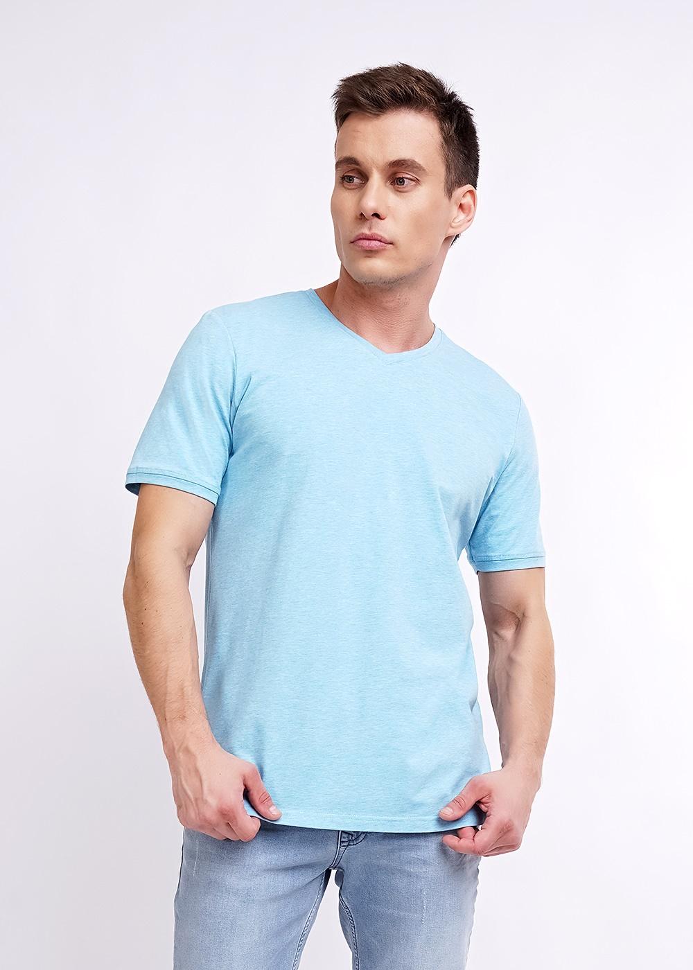 Базовая однотонная футболка стандартного объема с V вырезом горловины, втачным рукавом из хлопкового меланжевого полотна с добавлением эластана. Является неотъемлемой частью мужского гардероба.