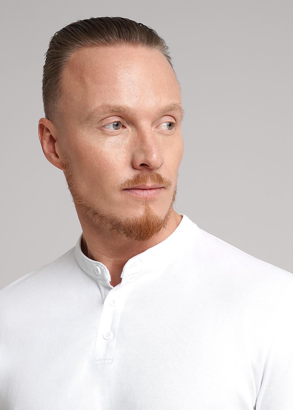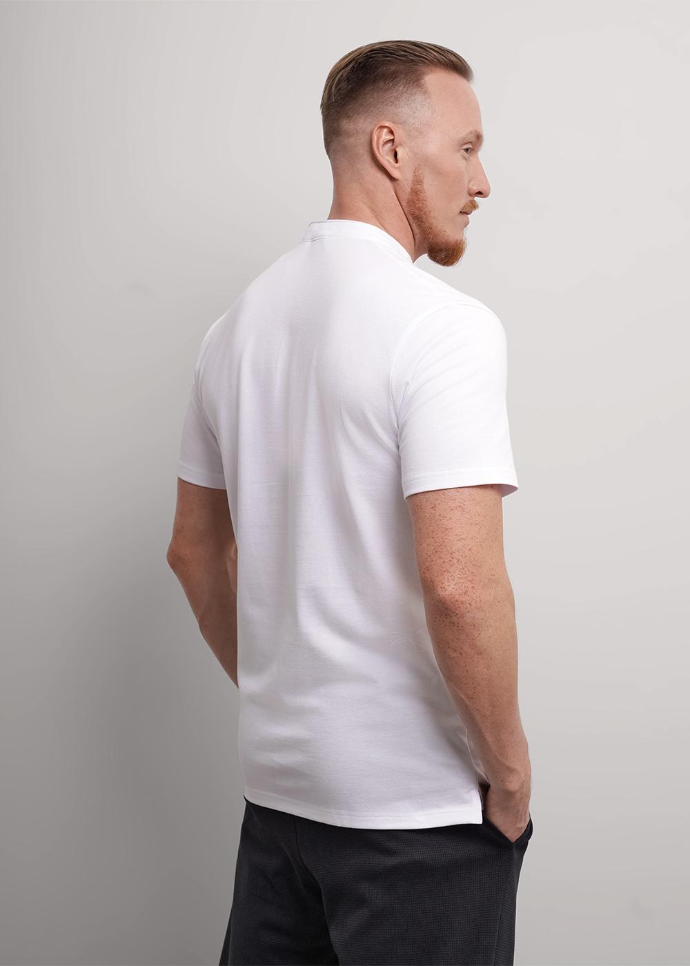 Футболка-поло с воротником-стойка и функциональной планкой на пуговицах, из смесового полотна. Составит отличный комплект с брюками для школы и офиса.