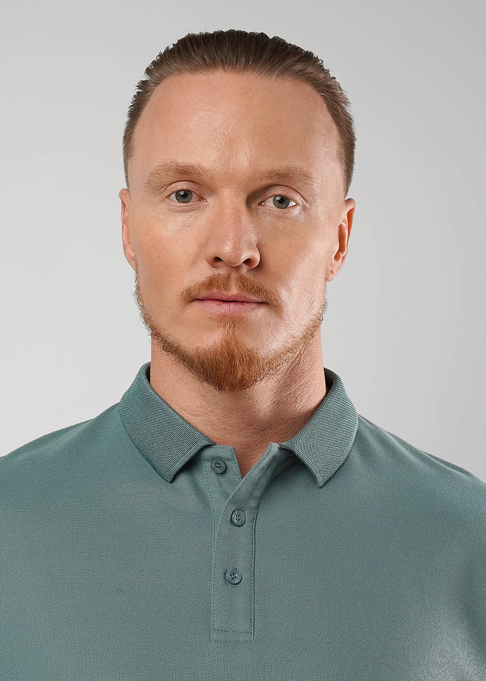 Мужская базовая футболка-поло. Модель дополнена вязанными отделками, фирменной фурнитурой и вышивкой. Изделие отлично сочетается с любыми брюками или джинсами.