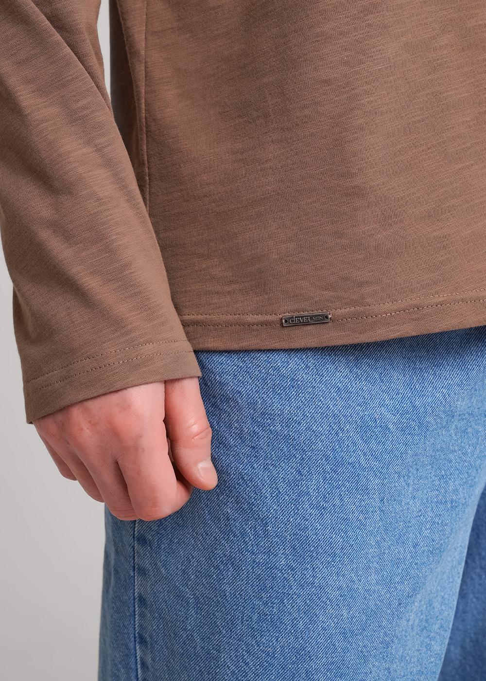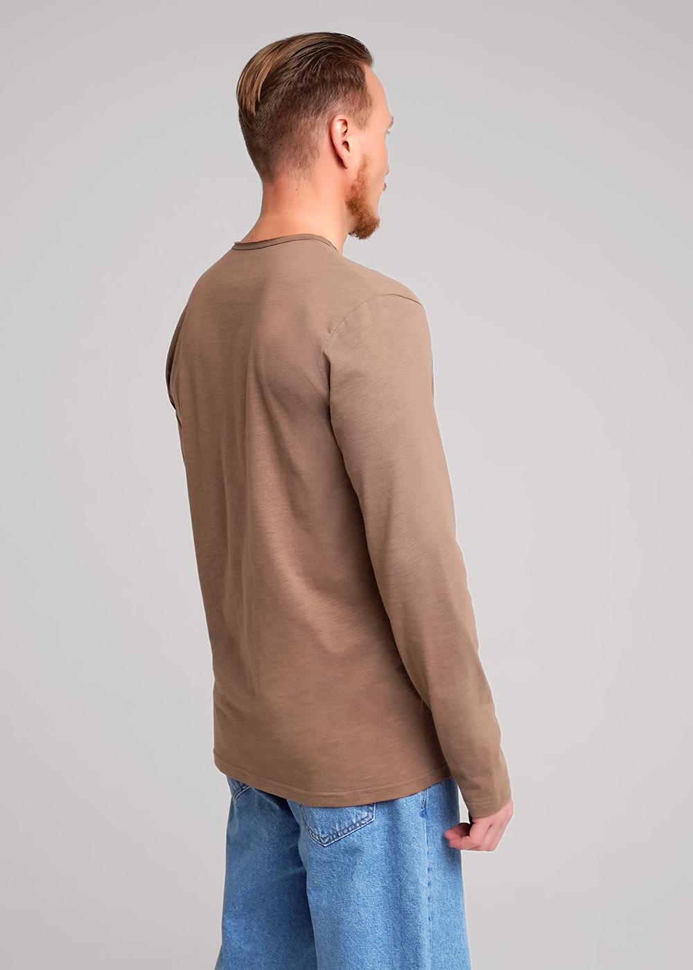 Лонгслив мужской с длинным рукавом, округлой необработанной горловиной на планке из фактурного полотна флам. Изделие дополнено имиджевой фурнитурой. Данная модель прекрасно комбинируется с джинсами или шортами благодаря своей универсальности.