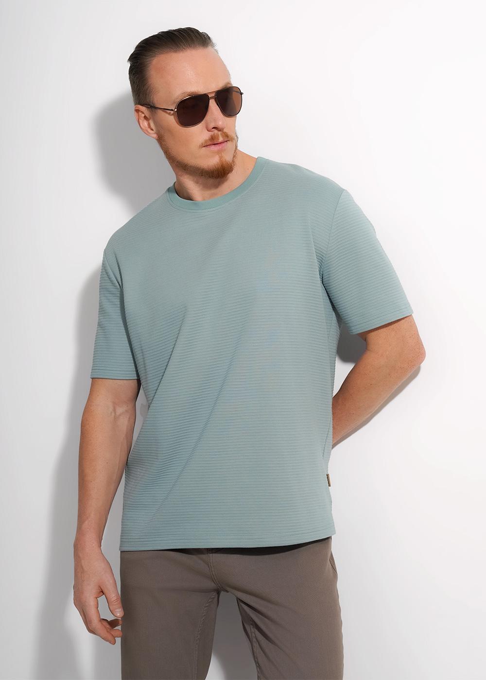 Описание: Футболка мужская, увеличенного обьема, из трикотажного фактурного полотна с эффектом валиков. Круглый вырез горловины и короткий втачной рукав. Отличный вариант для повседневного образа.