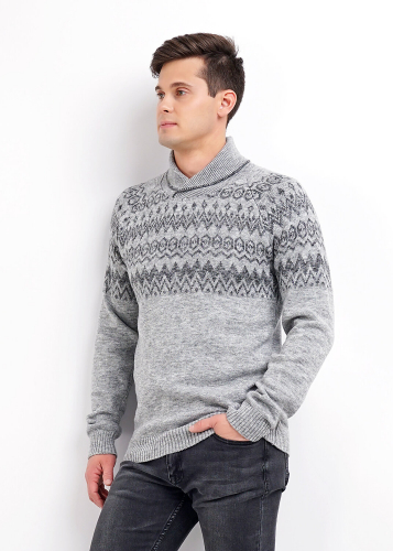Мужской вязаный джемпер из смесовой пряжи с эстетичным узором на уровне плеч. Благодаря шалевому воротнику модель будет удерживать тепло, а комбинация с рубашкой и брюками сделает деловой образ более лаконичным и завершенным.