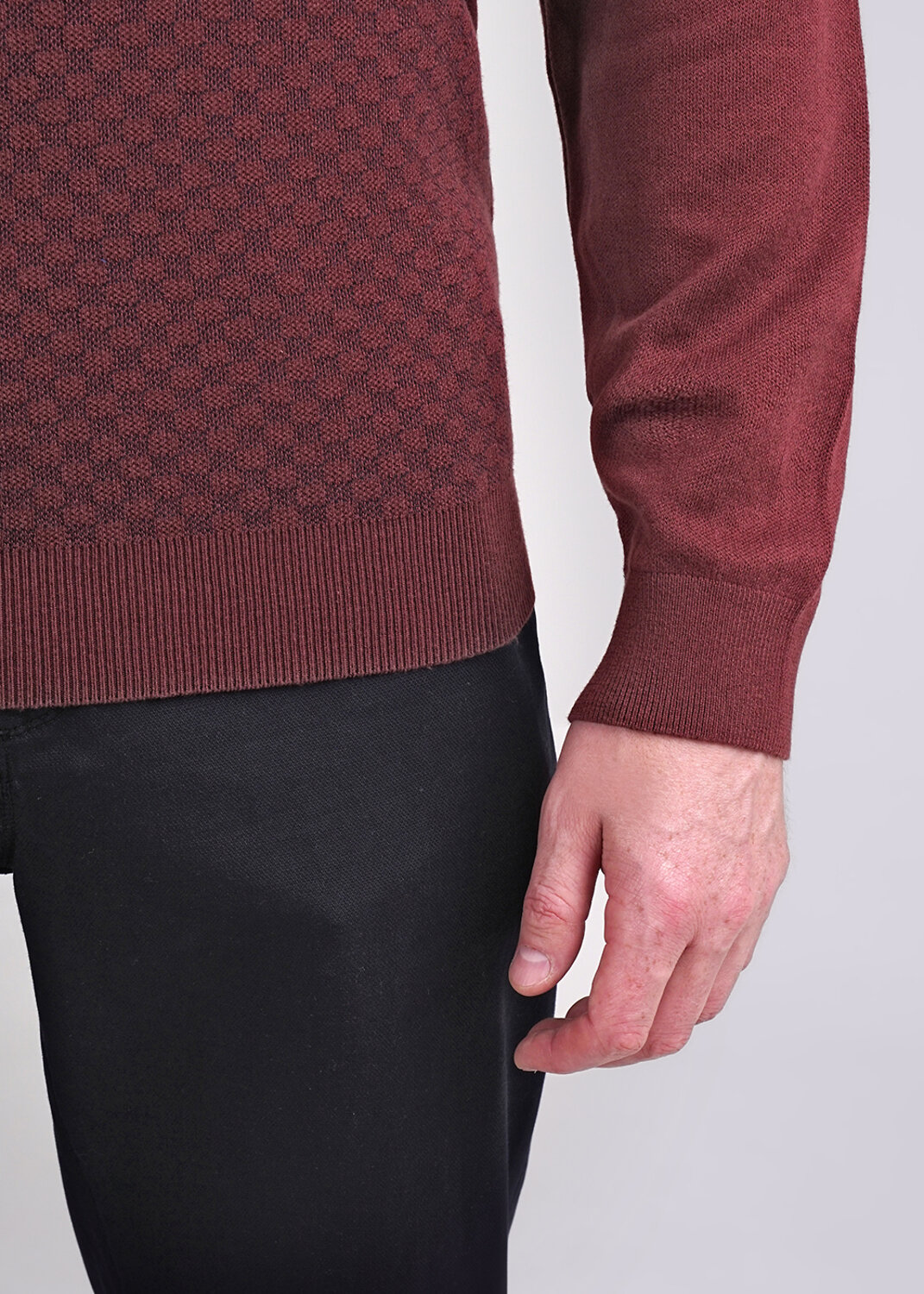 Мужская водолазка с воротником-стойкой и длинным рукавом. Выполнена из смесовой пряжи с большим содержанием хлопка. Модель с геометрическим орнаментом по переду, подходит для формальных и повседневных встреч.