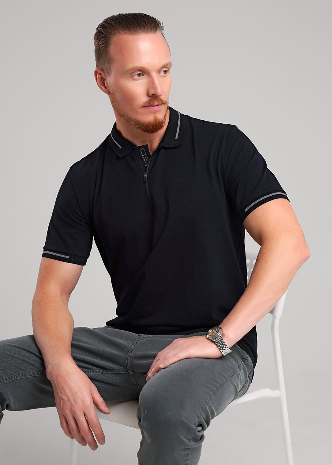 Футболка поло на поясе из трикотажного плотного, гладкого полотна. Вязаные отделки. Короткие рукава. Застежка на молнию. Изделие дополнено имиджевым принтом и вышивкой. Отличный вариант для встреч с друзьями.