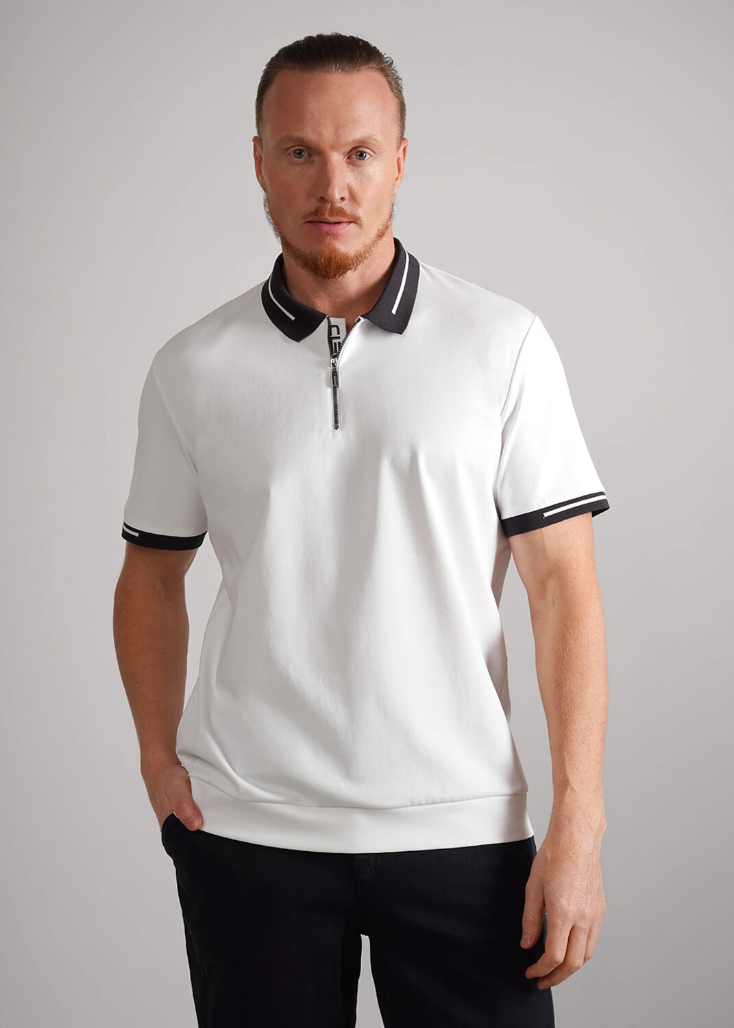Футболка поло на поясе из трикотажного плотного, гладкого полотна. Вязаные отделки. Короткие рукава. Застежка на молнию. Изделие дополнено имиджевым принтом и вышивкой. Отличный вариант для встреч с друзьями.