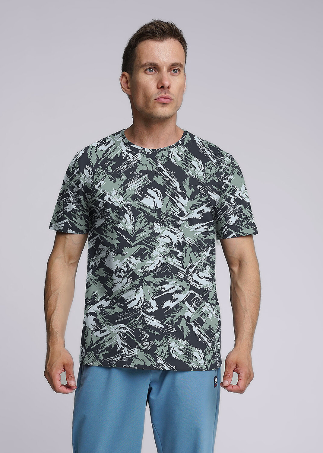 Стильная мужская футболка с круглым вырезом горловины и коротким рукавом. Изделие из приятного хлопкового полотна с эластаном в яркую авторскую набивку. Модель отлично подойдет к брюками или джинсам.