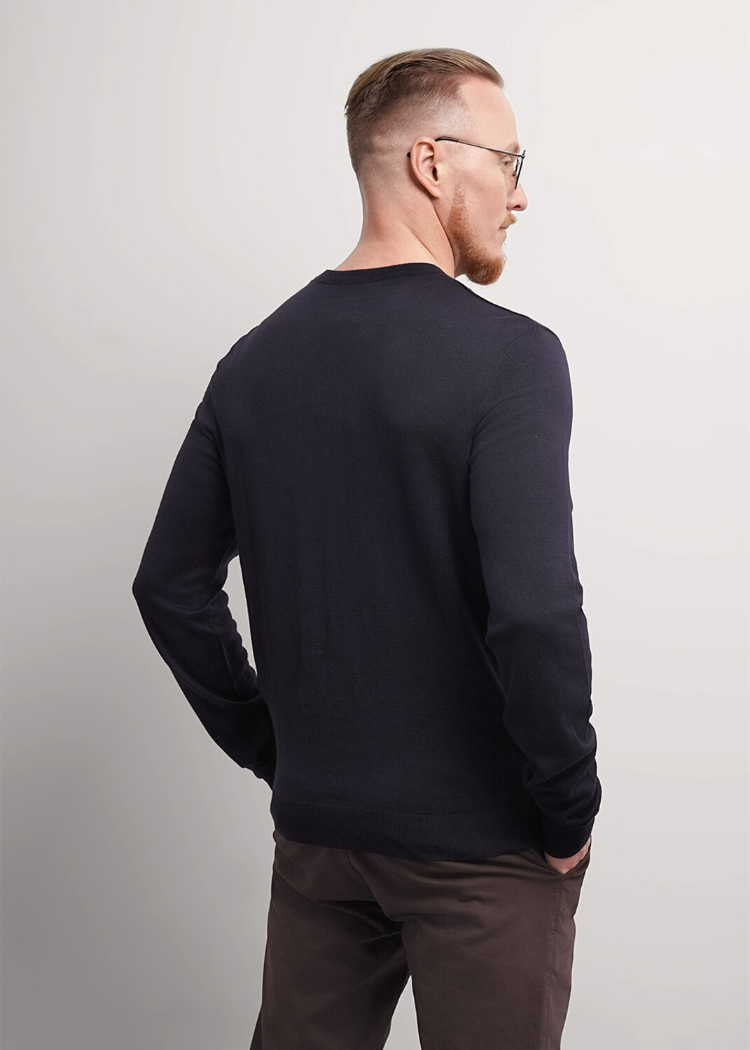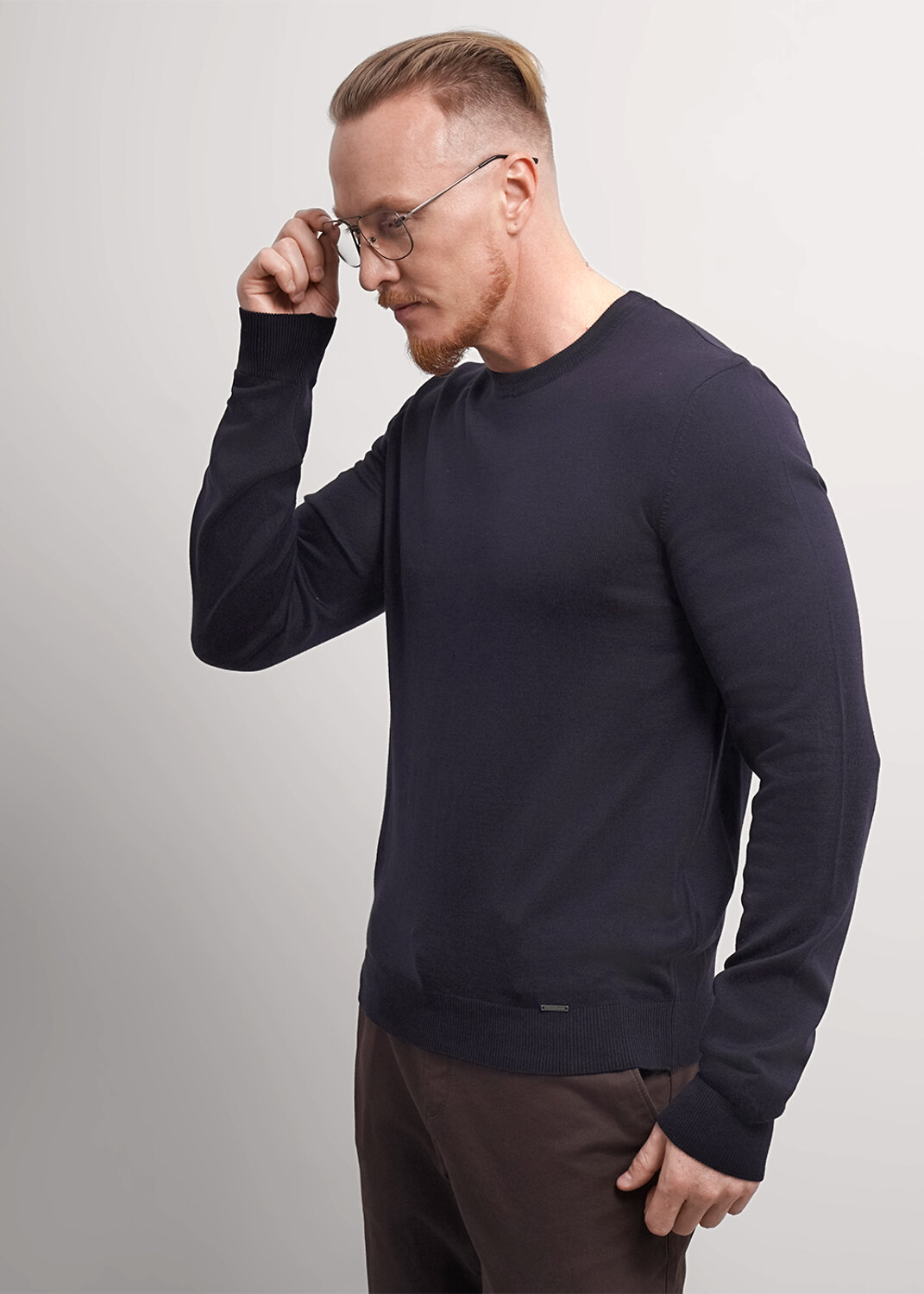 Классический вязаный джемпер с круглой горловиной. Изделие изготовлено из смесовой пряжи с содержанием хлопка. Данный джемпер удачно впишется в повседневный гардероб современного мужчины, привнося тепло, комфорт и элегантность одновременно.