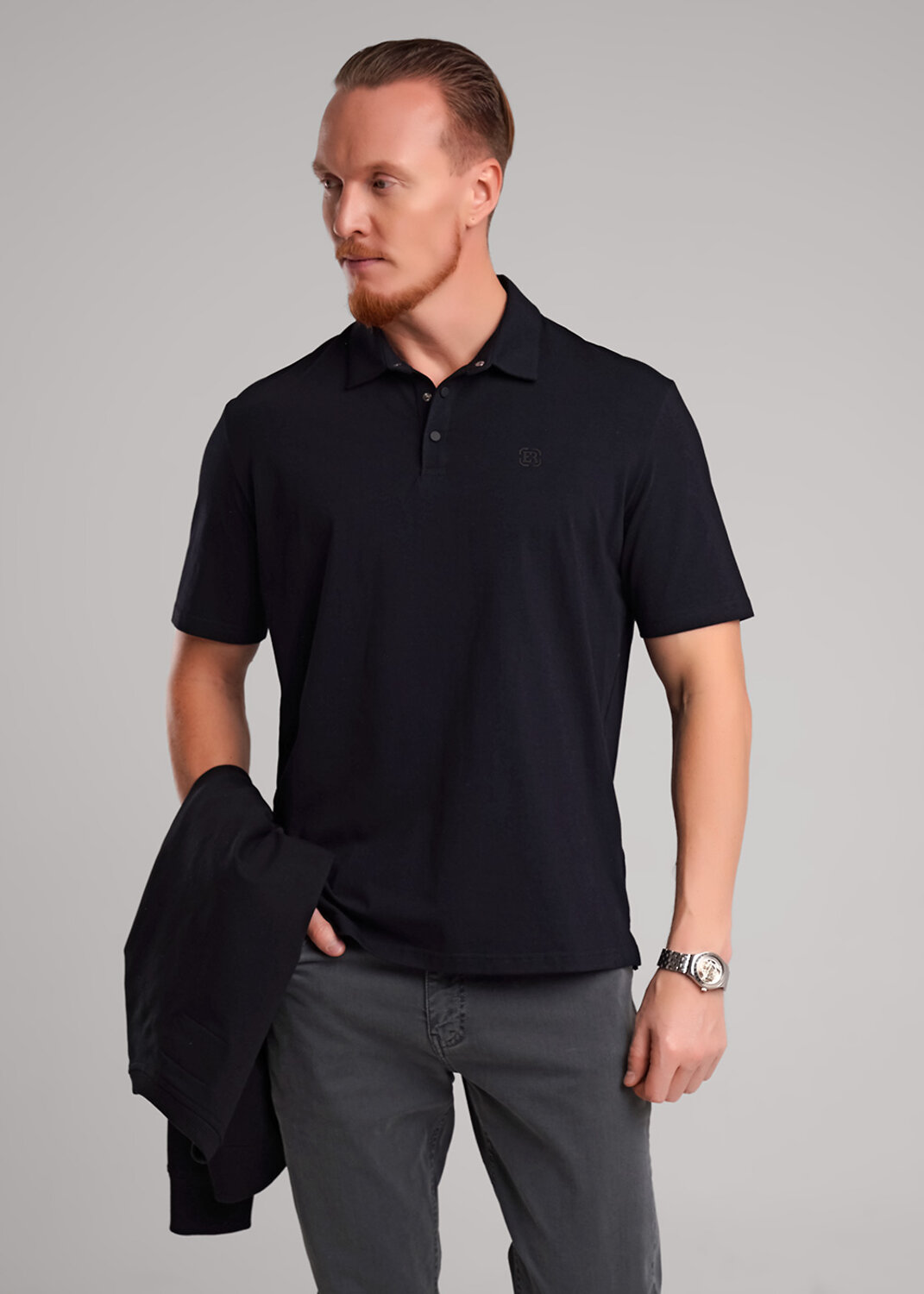 Футболка поло прямого кроя из трикотажного плотного, гладкого полотна. Отложной воротник. Короткие рукава. Застежка на кнопки. Изделие дополнено имиджевым принтом. Отличный вариант для встреч с друзьями.