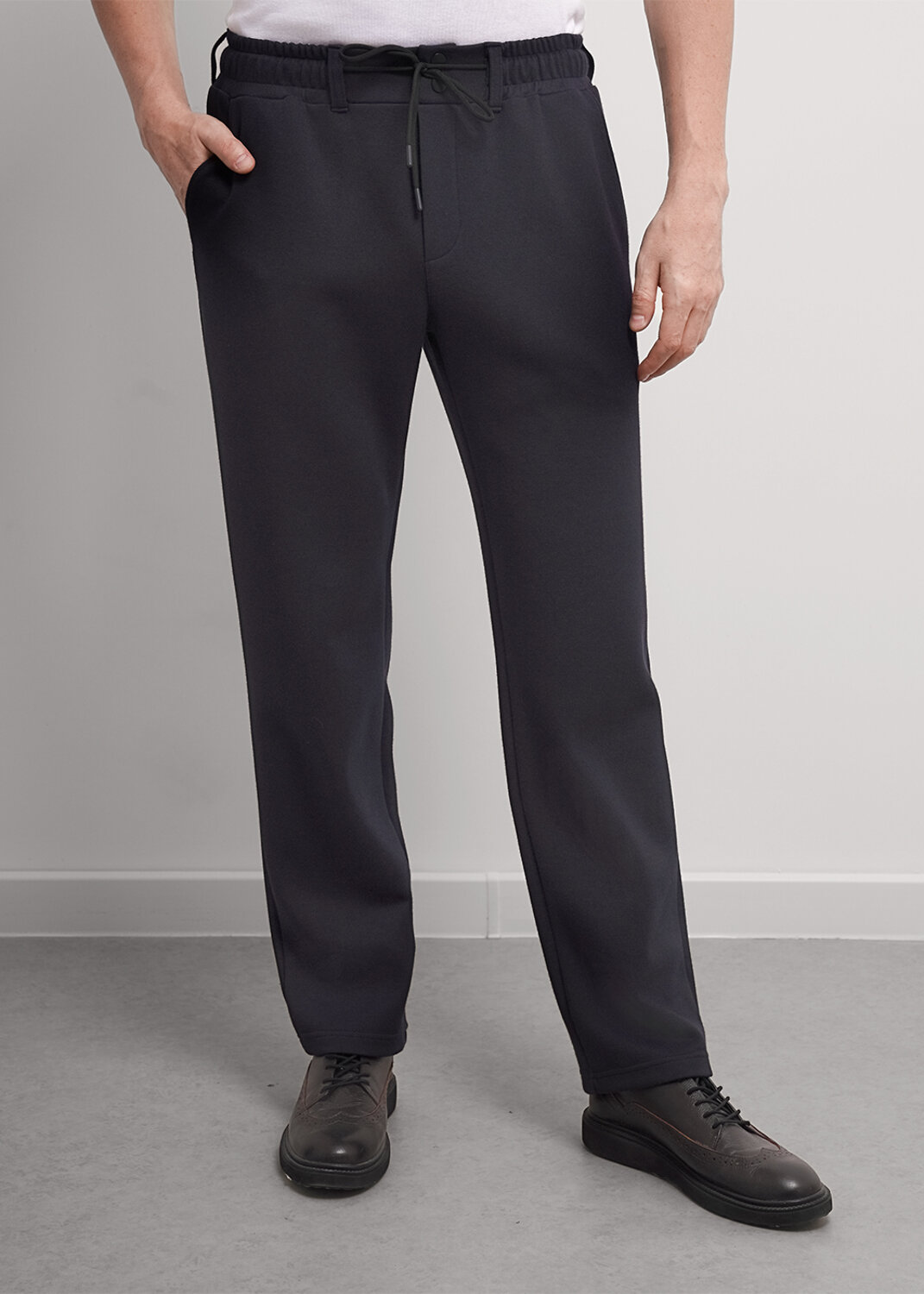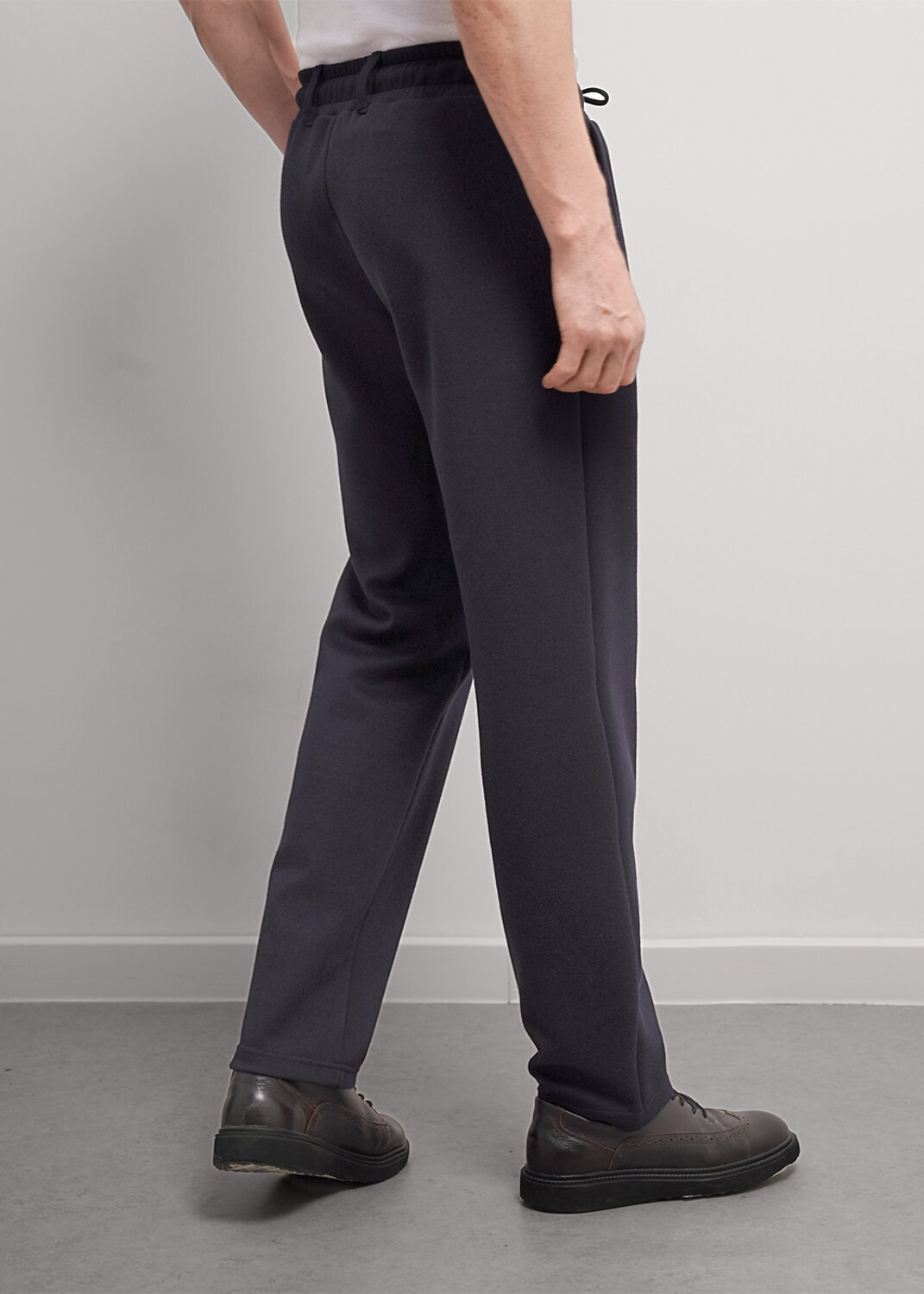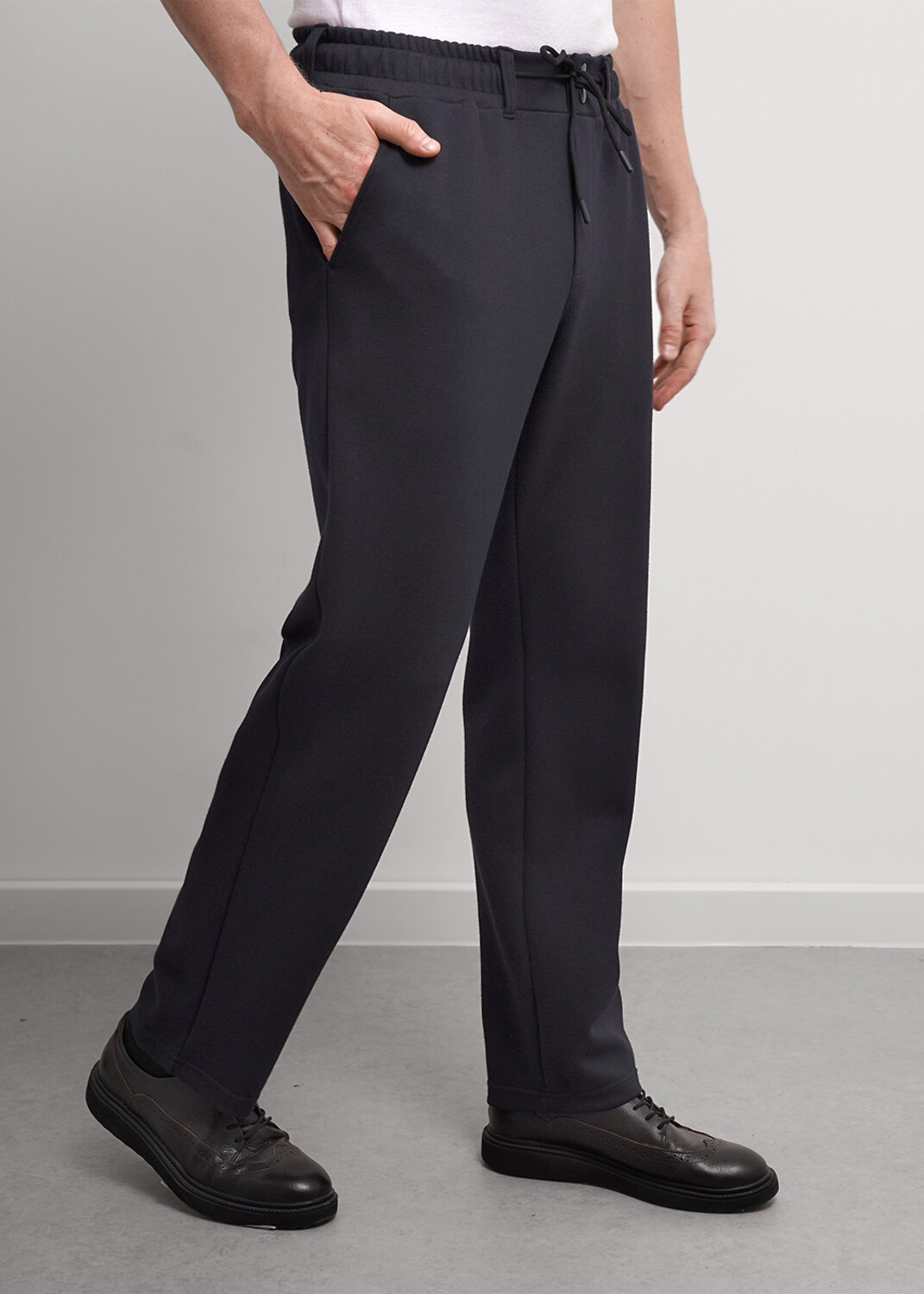 Прямые мужские зауженные брюки из фактурного трикотажного полотна, с регулируемой талией на резинке и шнуре. Функциональности модели придают боковые карманы. Идеально подойдут для учебы и работы.