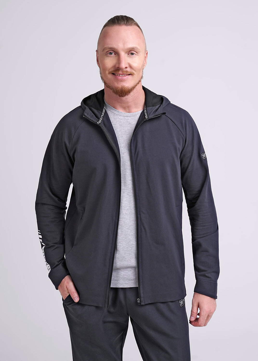 Мужская куртка из футера на молнии. Изделие дополнено 2-мя вместительными карманами на молнии, имиджевой фурнитурой и дизайнерским принтом. Комфортный и практичный вариант для активных мужчин.
