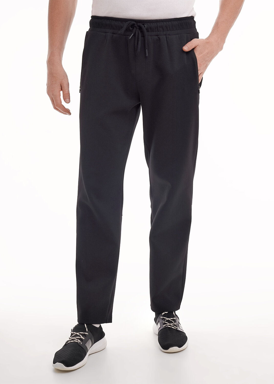 Прямые мужские зауженные брюки из трикотажного полотна с регулируемой талией. Функциональность модели придают боковые карманы, а интересным акцентом в изделии является фирменная фурнитура и дизайнерский принт. Брюки эргономичные и удобные.
