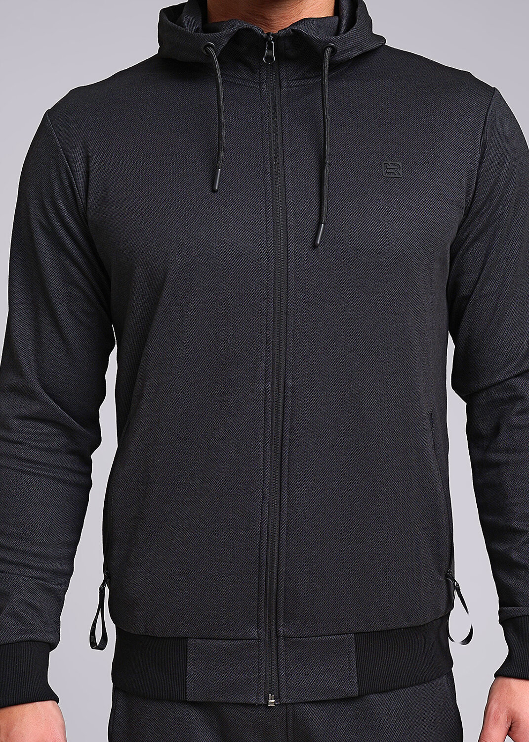 Куртка мужская с застежкой-молнией по переду на капюшоне из плотного пике. Рукава втачные с манжетой, по низу пояс. На капюшоне люверсы со шнуром и наконечниками. Для функциональности и удобства спереди карманы на молнии с тесьмой.