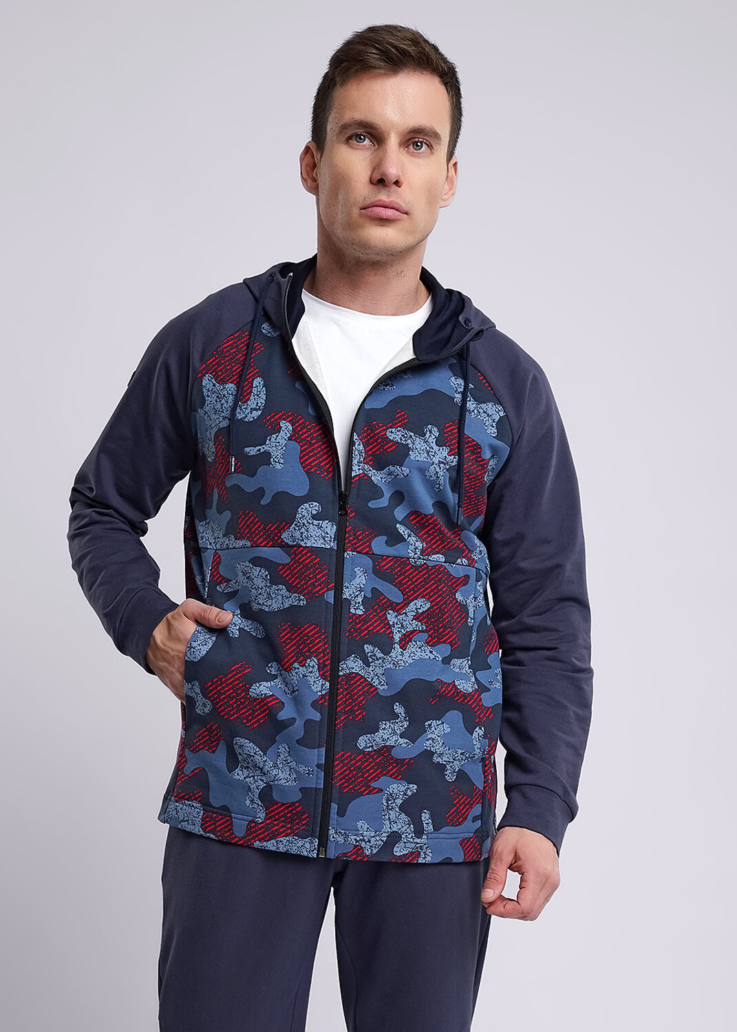 Куртка мужская комбинированная из плотного футера. Изделие на капюшоне с вместительными карманами, дополнена фирменной фурнитурой, рукава покроя реглан с манжетом по низу. Удобный и практичный вариант на каждый день.