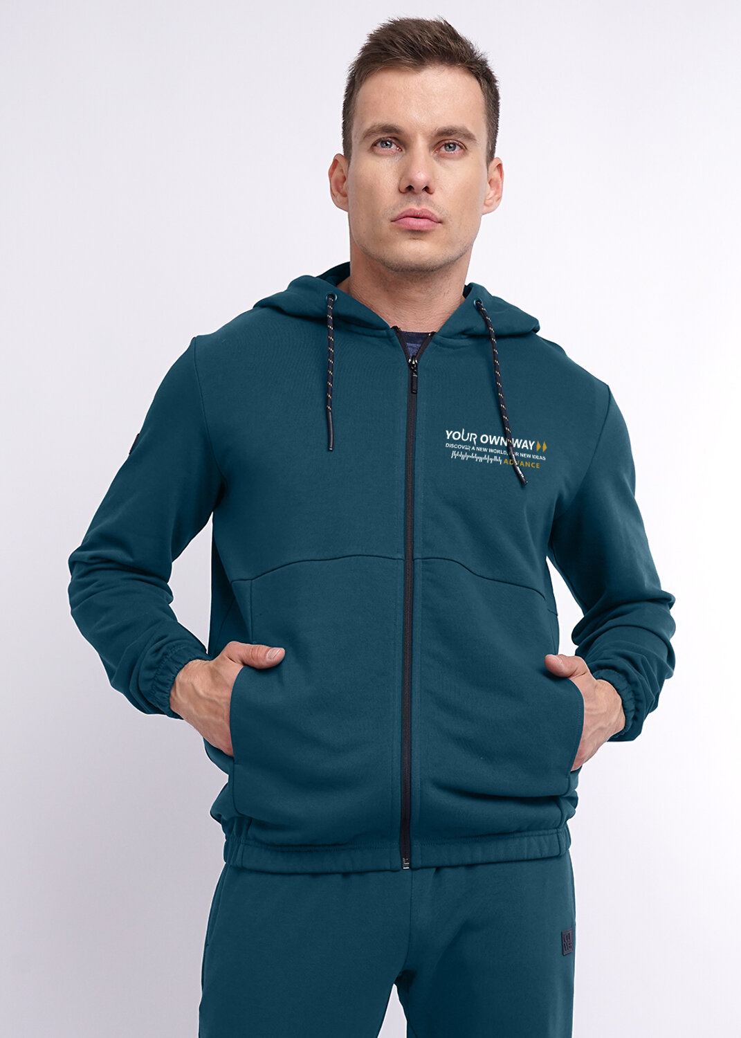 Мужская куртка из футера с капюшоном на застежке-молнии, по низу манжеты на резинке. Модель с резами и боковыми карманами, дополнена имиджевой фурнитурой и текстовым принтом. Будет незаменимой вещью в гардеробе и составит отличный комплект с брюками.