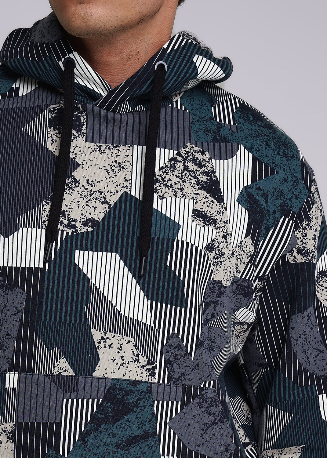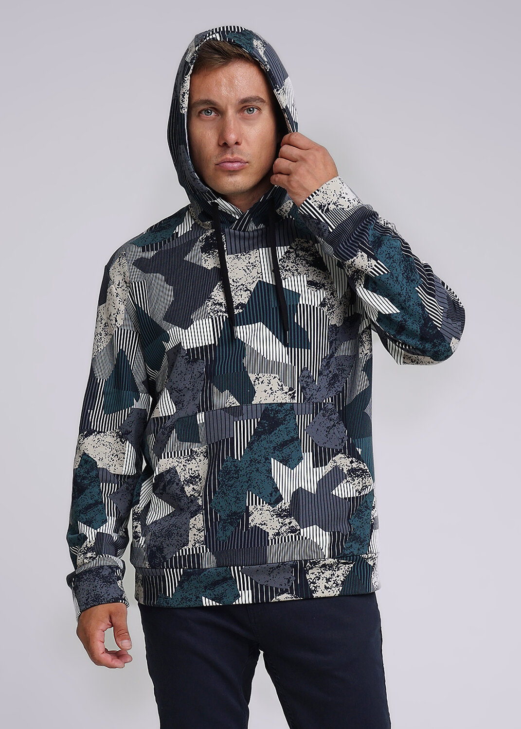 Молодежное худи из футера с капюшоном и регулируемым шнуром, с удобным спущенным рукавом и карманом "кенгуру". Модель интересна благодаря абстрактной набивке. Составит отличный комплект с брюками.