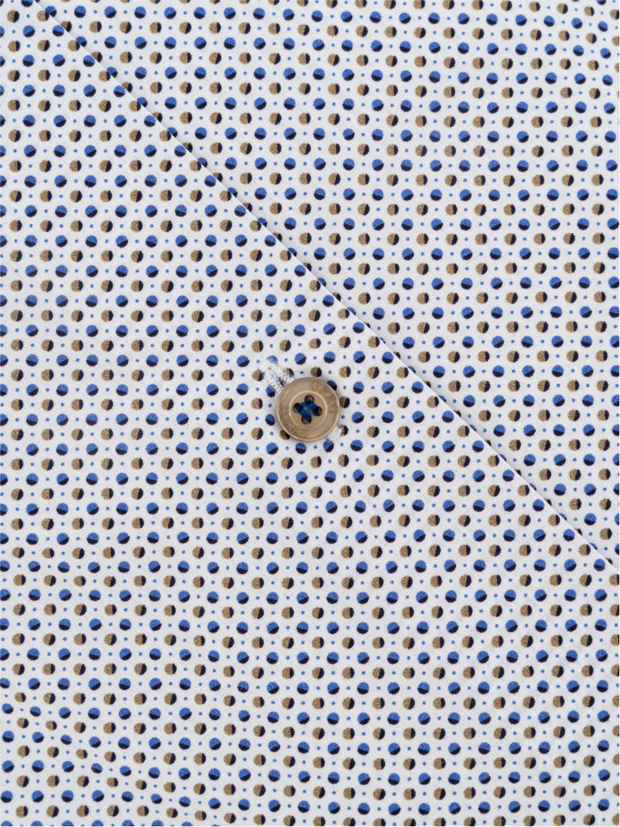 Цвет: Белый Рисунок: В мелкие эле..показатьменты Состав: 100% хлопок Easy Care Модель: Зауженная Ворот: Немецкий Караман: отсутствует Манжет: классический закругленный на пуговицах 6 см Силуэт: Полуприталенный силуэт / Regular fit Отделка: Сорочки- внутренняя стойка воротника и внутренний манжет из ткани компаньонаменты