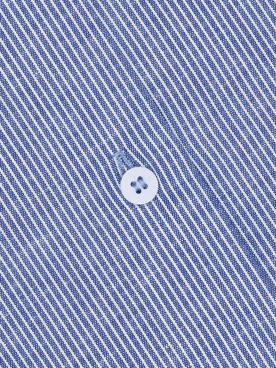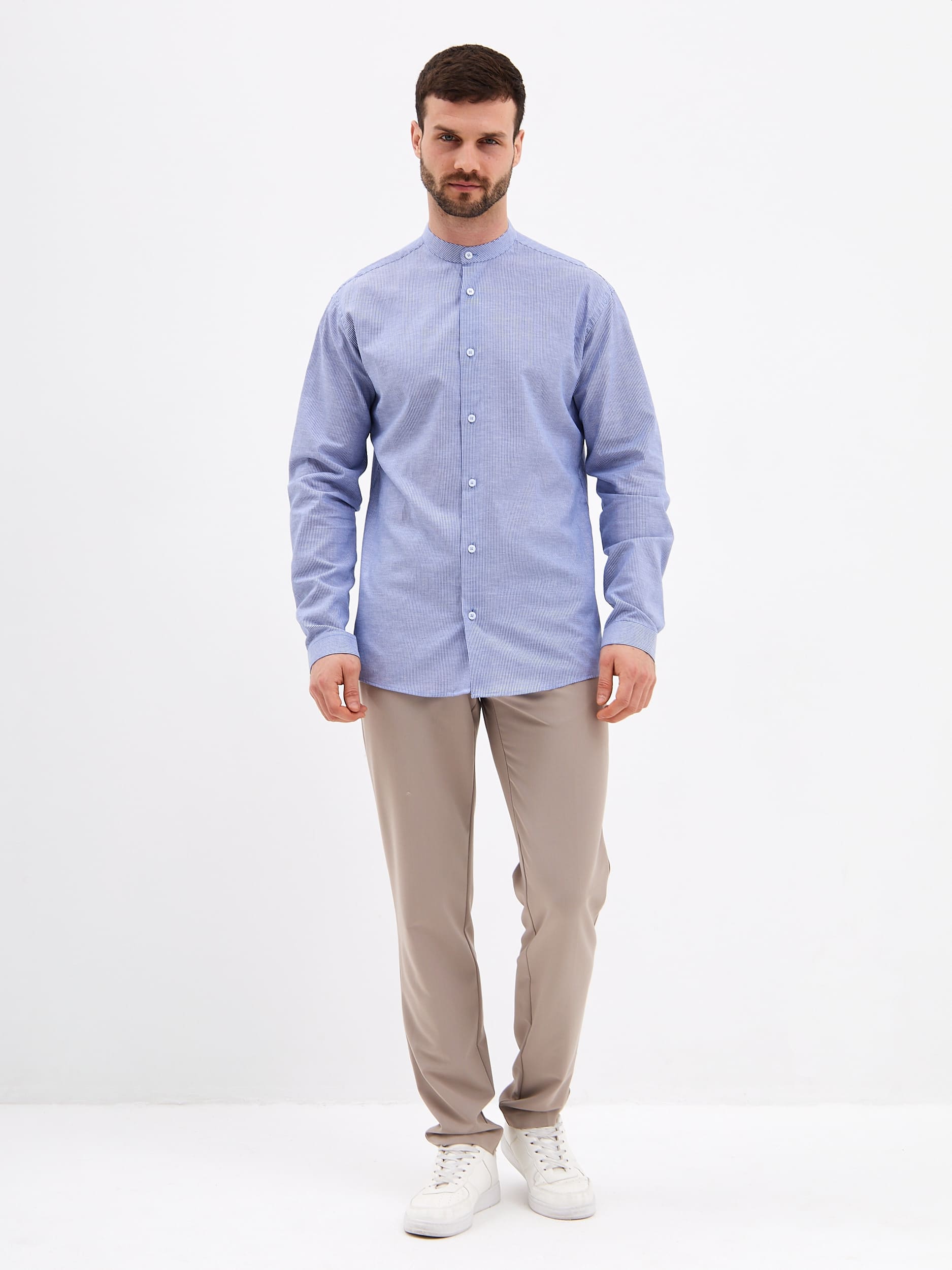 Цвет: Голубой Рисунок: Полоска..показатьi> Состав: 60% хлопок 40% лен Модель: Зауженная Ворот: Стойка Караман: отсутствует Манжет: классический закругленный на пуговицах 4 см мягкий Силуэт: Полуприталенный силуэт / Regular fiti>