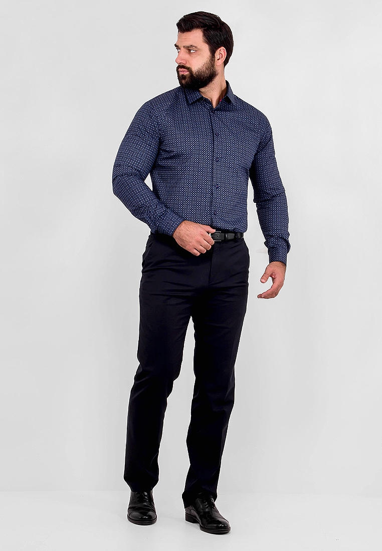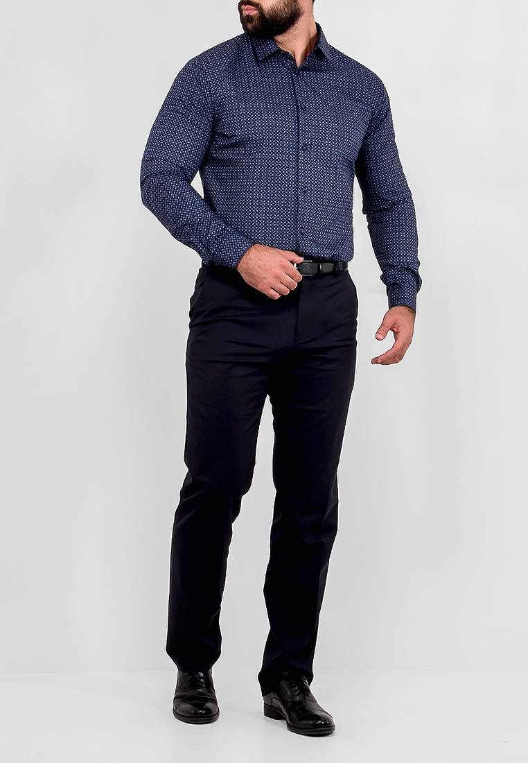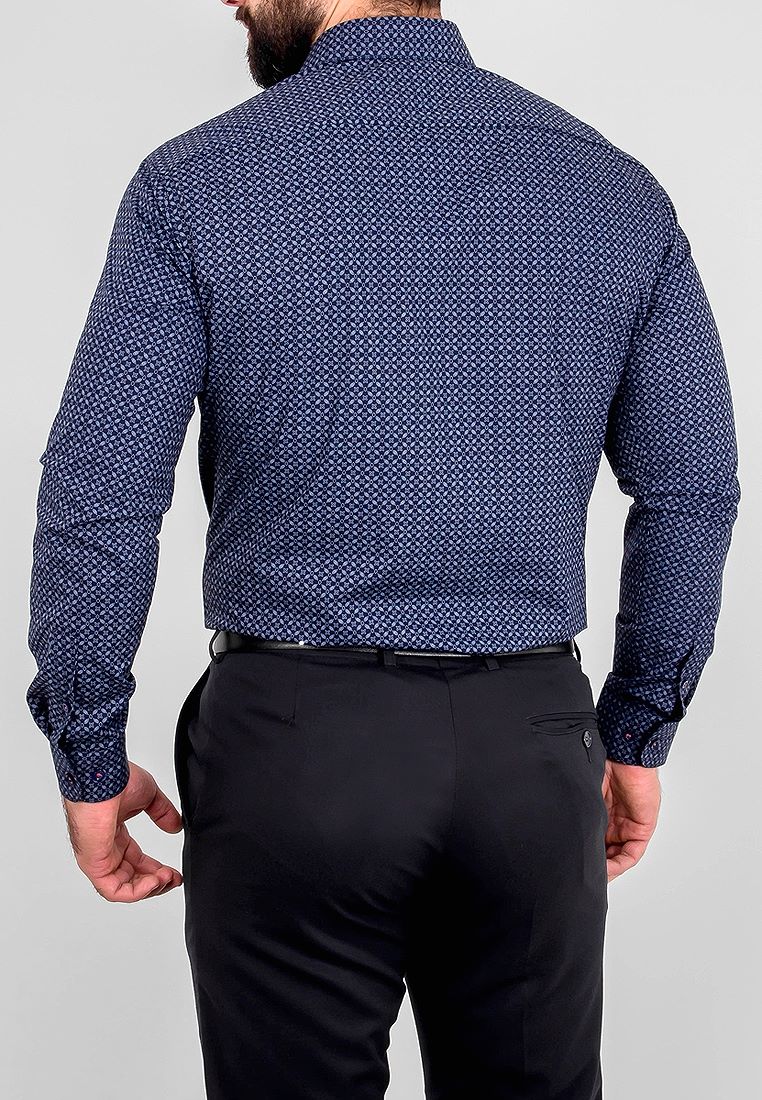 Цвет: Синий Рисунок: В крупные эл..показатьементы Состав: 100% хлопок Модель: Зауженная Ворот: Французский маленький Караман: отсутствует Манжет: классический закругленный на пуговицах 6 см Силуэт: Полуприталенный силуэт / Regular fit Отделка: Сорочки- внутренняя стойка воротника и внутренний манжет из ткани компаньонаементы