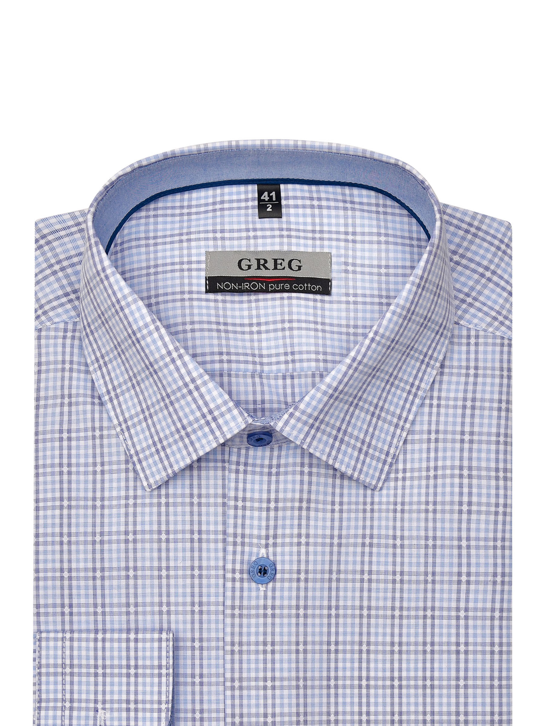 Цвет: Голубой Рисунок: Клетка..показать> Состав: 100% хлопок Non Iron Модель: Зауженная Ворот: Немецкий Караман: отсутствует Манжет: классический закругленный на пуговицах 6 см Силуэт: Полуприталенный силуэт / Regular fit Отделка: Сорочки- внутренняя стойка воротника и внутренний манжет из ткани компаньона>