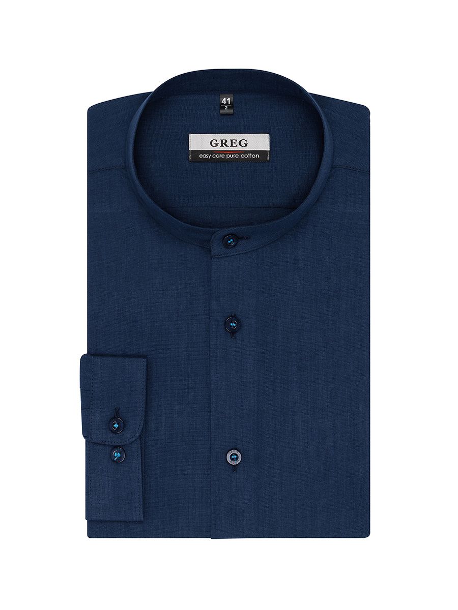Цвет: Синий Рисунок: Однотон с фа..показатьктурой Состав: 100% хлопок Easy Care Модель: Зауженная Ворот: Стойка Караман: отсутствует Манжет: классический закругленный на пуговицах 4 см мягкий Силуэт: Полуприталенный силуэт / Regular fitктурой
