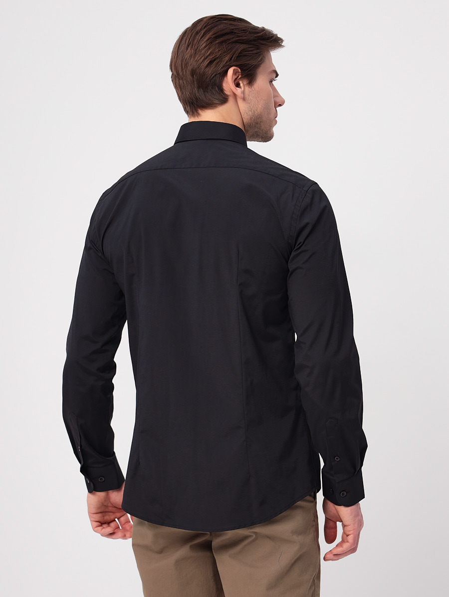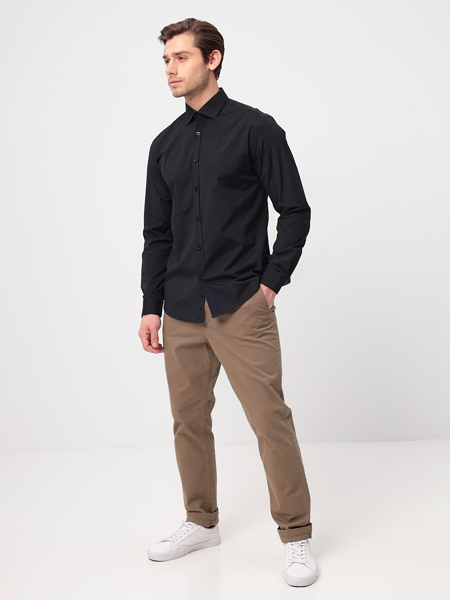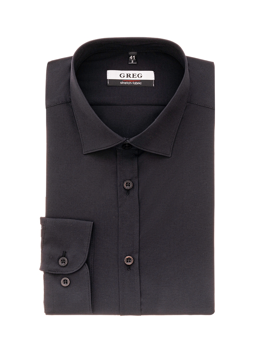 Цвет: Черный Рисунок: Без рисунка..показать Состав: 72% хлопок 24% нейлон 4% спандекс Модель: Зауженная с вытачками сзади и верхней планкой спереди Ворот: Французский маленький Караман: отсутствует Манжет: классический закругленный на пуговицах 6 см Силуэт: Приталенный силуэт / Slim fit
