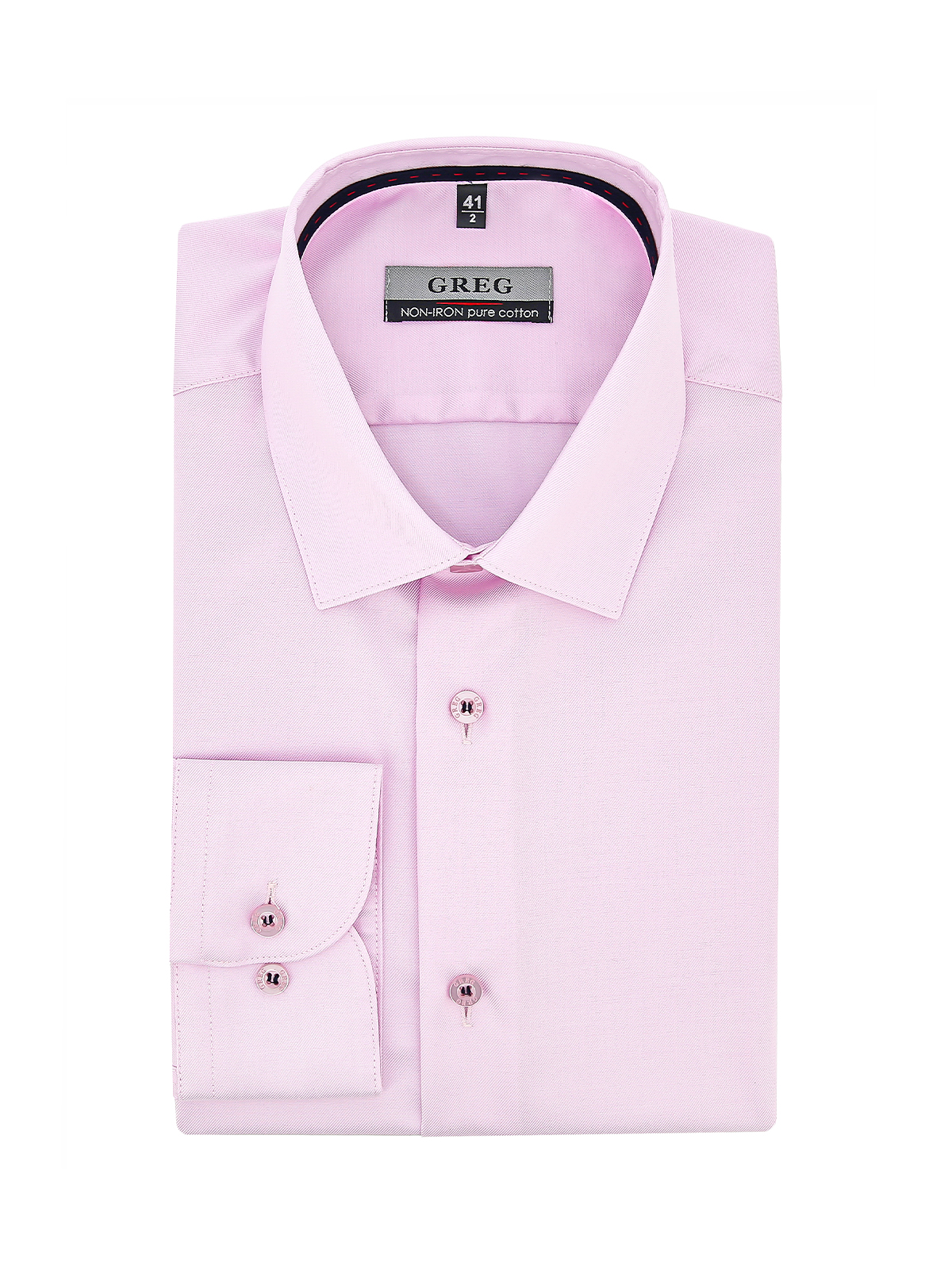 Цвет: Розовый Рисунок: Однотон с ..показатьфактурой Состав: 100% хлопок Non Iron Модель: Зауженная Ворот: Немецкий Караман: отсутствует Манжет: универсальный закругленный на пуговицах и под запонки Силуэт: Полуприталенный силуэт / Regular fit Отделка: Сорочки- тесьма по нижнему краю внутренней стойки воротникафактурой