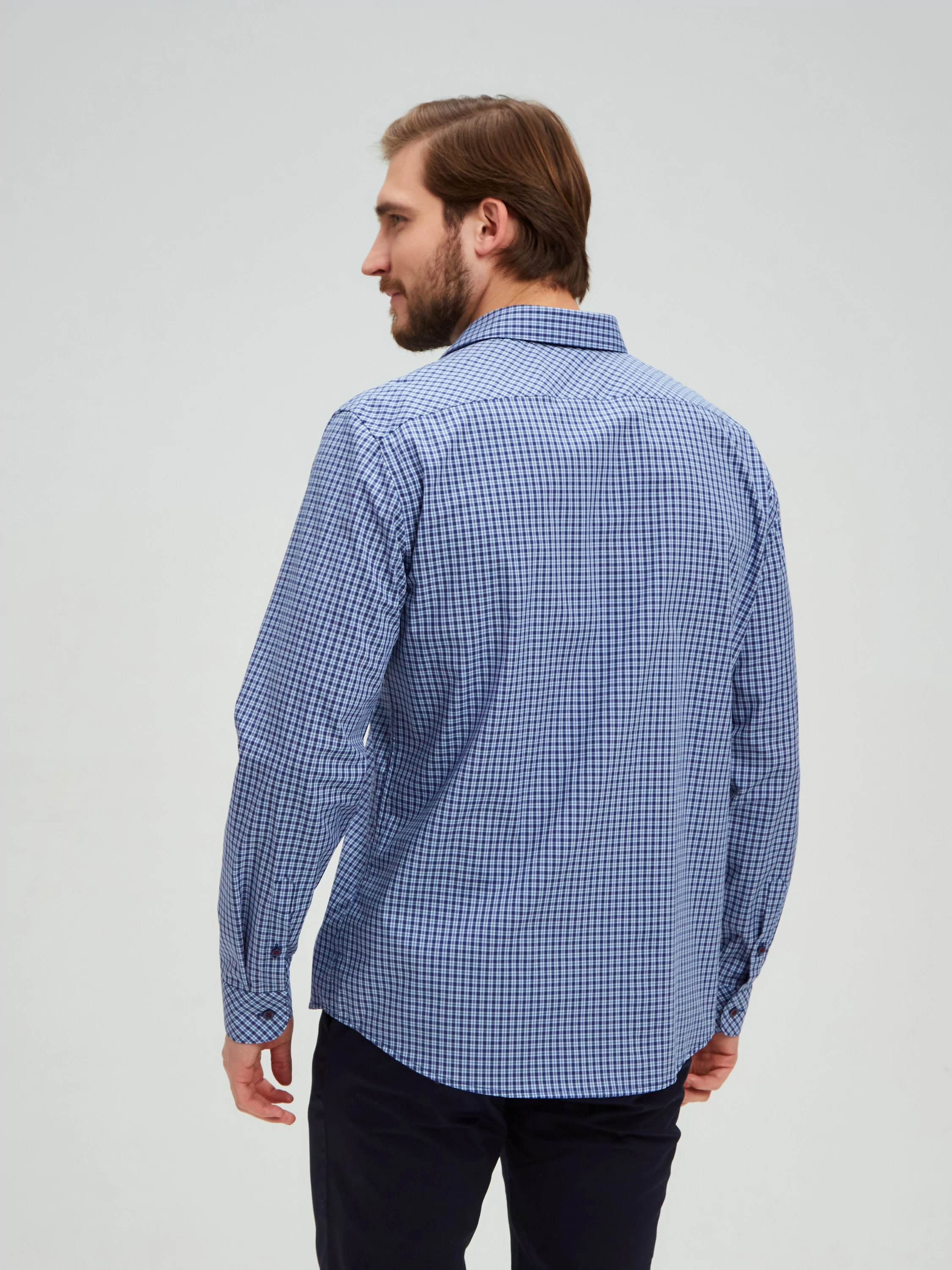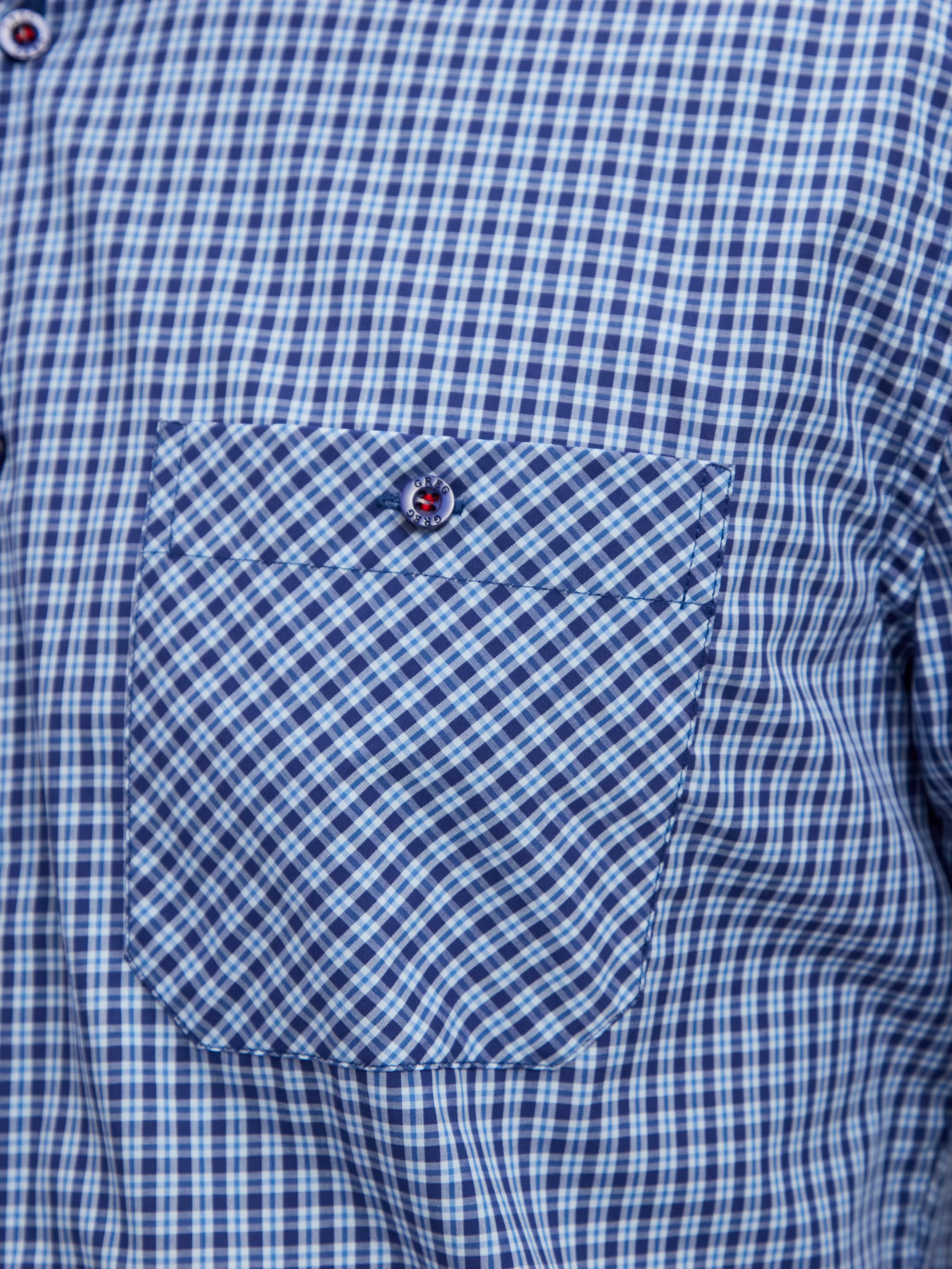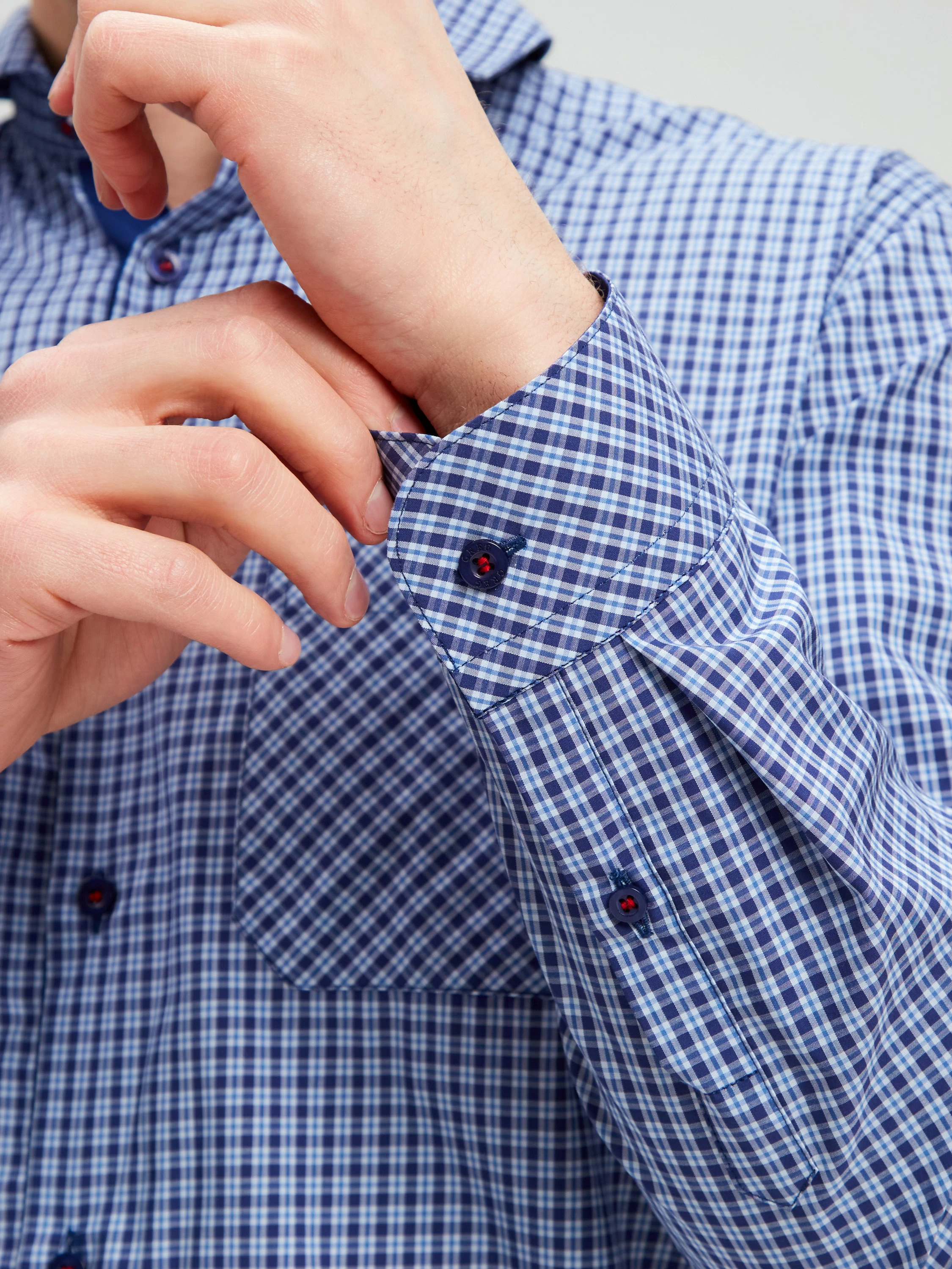 Цвет: Голубой Рисунок: Клетка..показать> Состав: 100% хлопок Non Iron Модель: Прилегающая Ворот: Немецкий мягкий Караман: два нагрудных накладных кармана по косой на пуговицах Манжет: классический закругленный на пуговицах 6 см, по косой Силуэт: Прилегающий силуэт / Super Slim fit Отделка: Сорочки- внутренняя стойка воротника, внутренний манжет и нижняя планка из ткани компаньона>