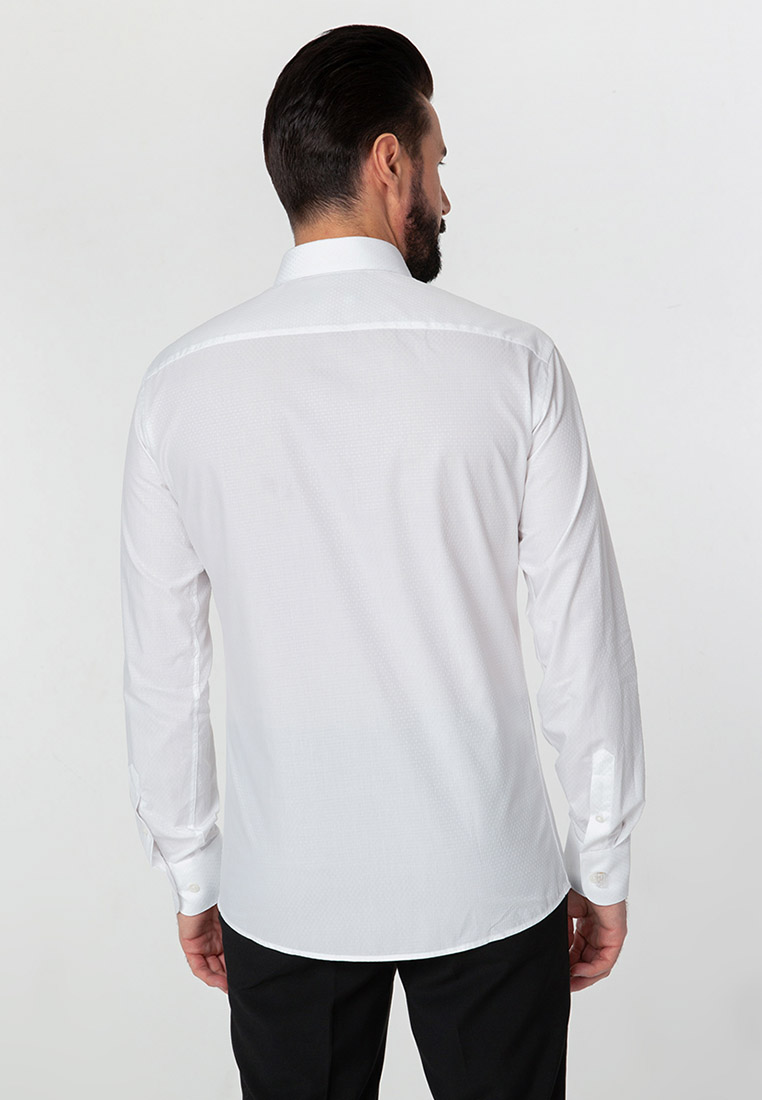 Цвет: Белый Рисунок: В мелкие эле..показатьменты Состав: 100% хлопок Easy Care Модель: Зауженная Ворот: Французский маленький Караман: отсутствует Манжет: универсальный закругленный на пуговицах и под запонки Силуэт: Полуприталенный силуэт / Regular fitменты