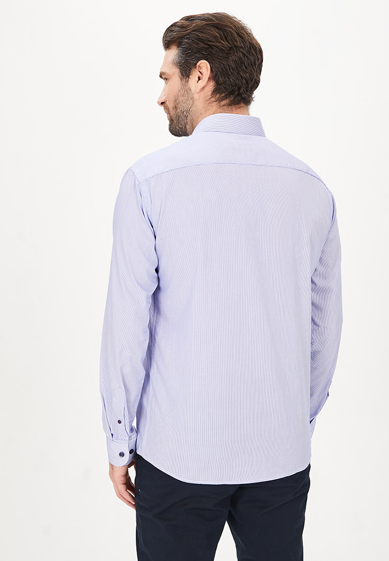 Цвет: Голубой Рисунок: Полоска..показатьi> Состав: 100% хлопок Easy Care Модель: Зауженная Ворот: Французский маленький Караман: отсутствует Манжет: классический закругленный на пуговицах 6 см Силуэт: Полуприталенный силуэт / Regular fit Отделка: Сорочки- внутренняя стойка воротника и внутренний манжет из ткани компаньонаi>
