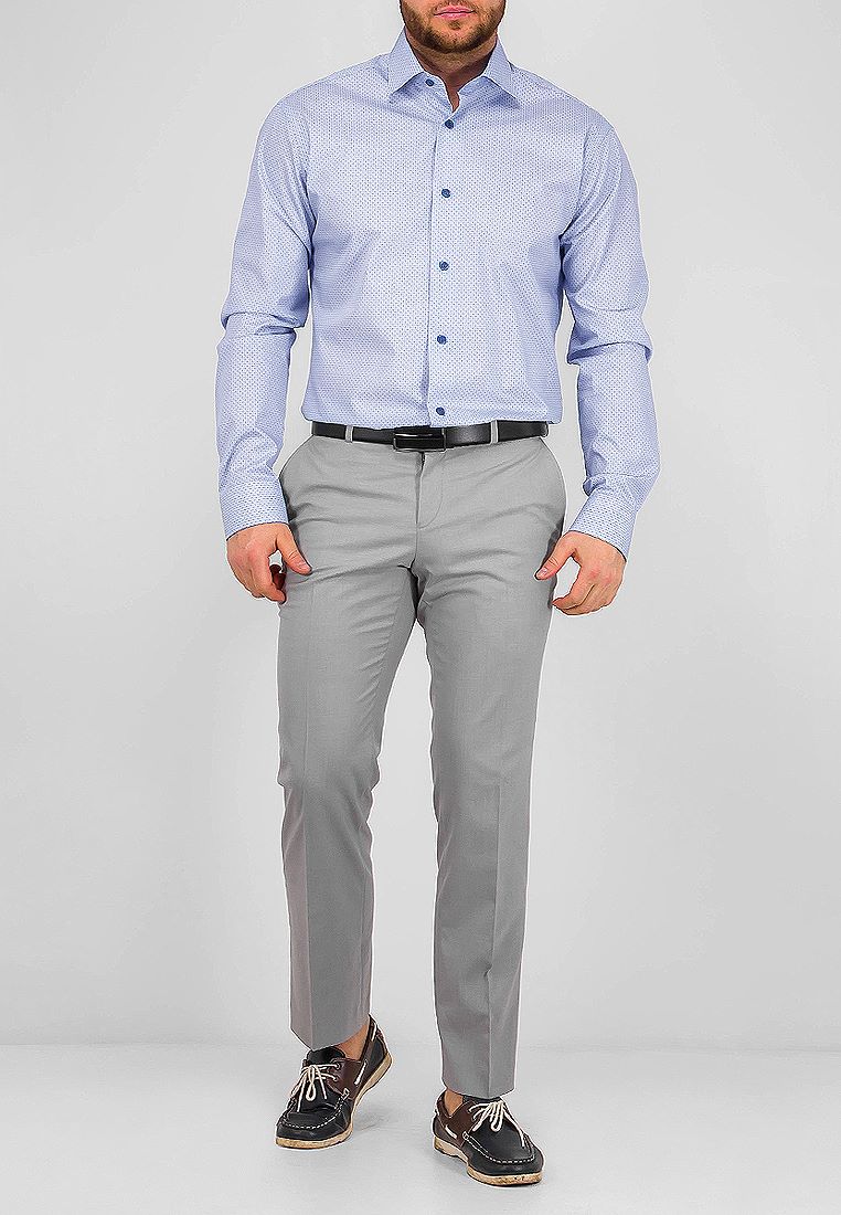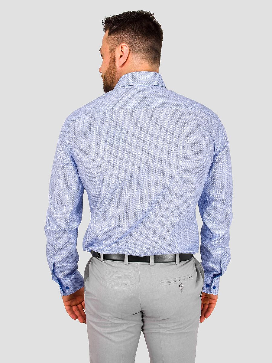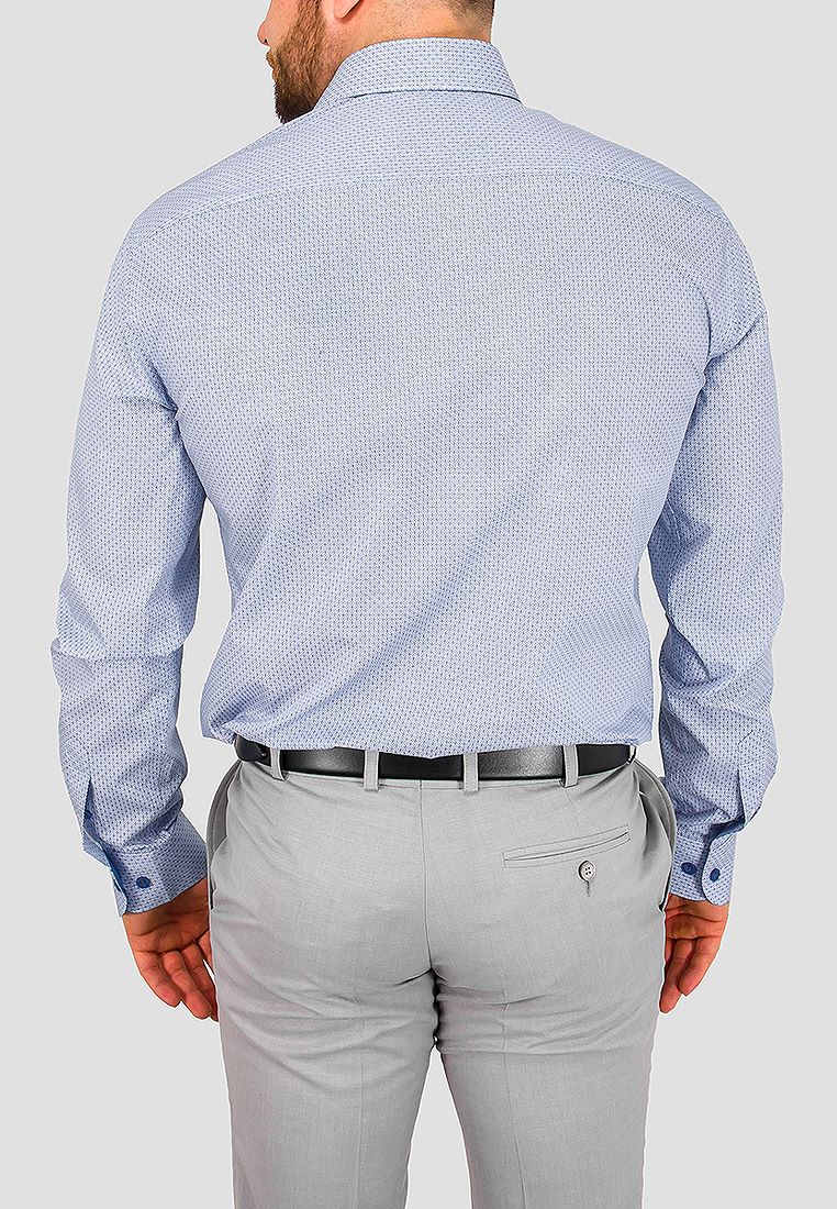 Цвет: Голубой Рисунок: В мелкие э..показатьлементы Состав: 100% хлопок Модель: Зауженная Ворот: Французский маленький Караман: отсутствует Манжет: классический закругленный на пуговицах 6 см Силуэт: Полуприталенный силуэт / Regular fit Отделка: Сорочки- внутренняя стойка воротника из ткани компаньоналементы