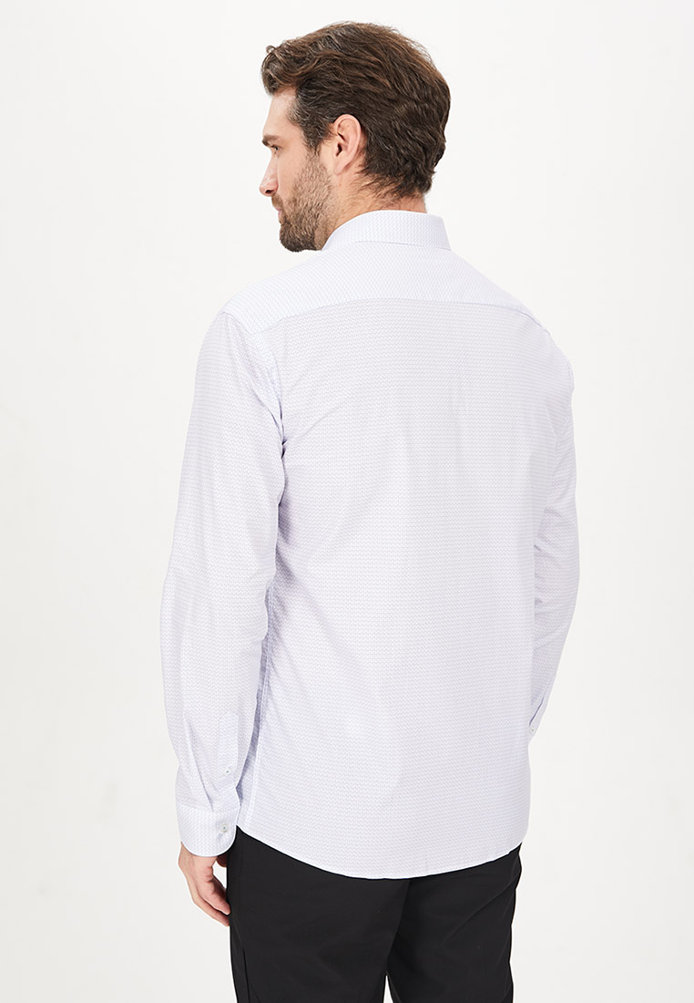Цвет: Белый Рисунок: В мелкие эле..показатьменты Состав: 100% хлопок Easy Care Модель: Зауженная Ворот: Французский маленький Караман: отсутствует Манжет: классический закругленный на пуговицах 6 см Силуэт: Полуприталенный силуэт / Regular fit Отделка: Сорочки- внутренняя стойка воротника и внутренний манжет из ткани компаньонаменты