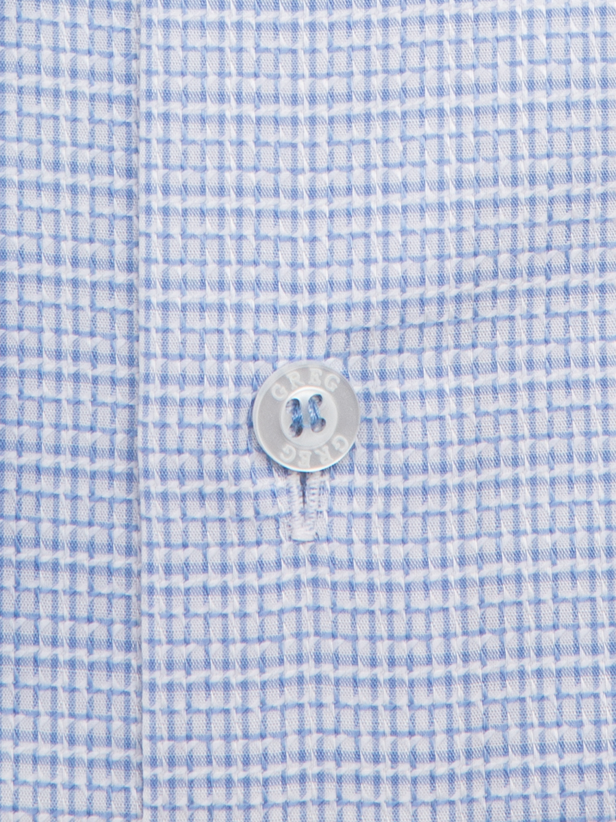 Цвет: Голубой Рисунок: Клетка..показать> Состав: 100% хлопок Non Iron Модель: Зауженная Ворот: Французский маленький Караман: отсутствует Манжет: универсальный закругленный на пуговицах и под запонки Силуэт: Полуприталенный силуэт / Regular fit>