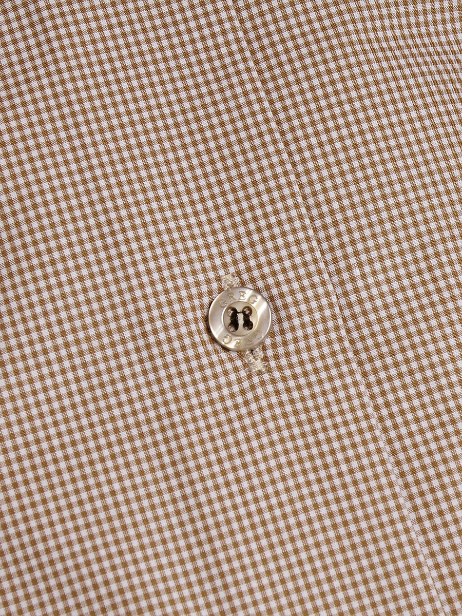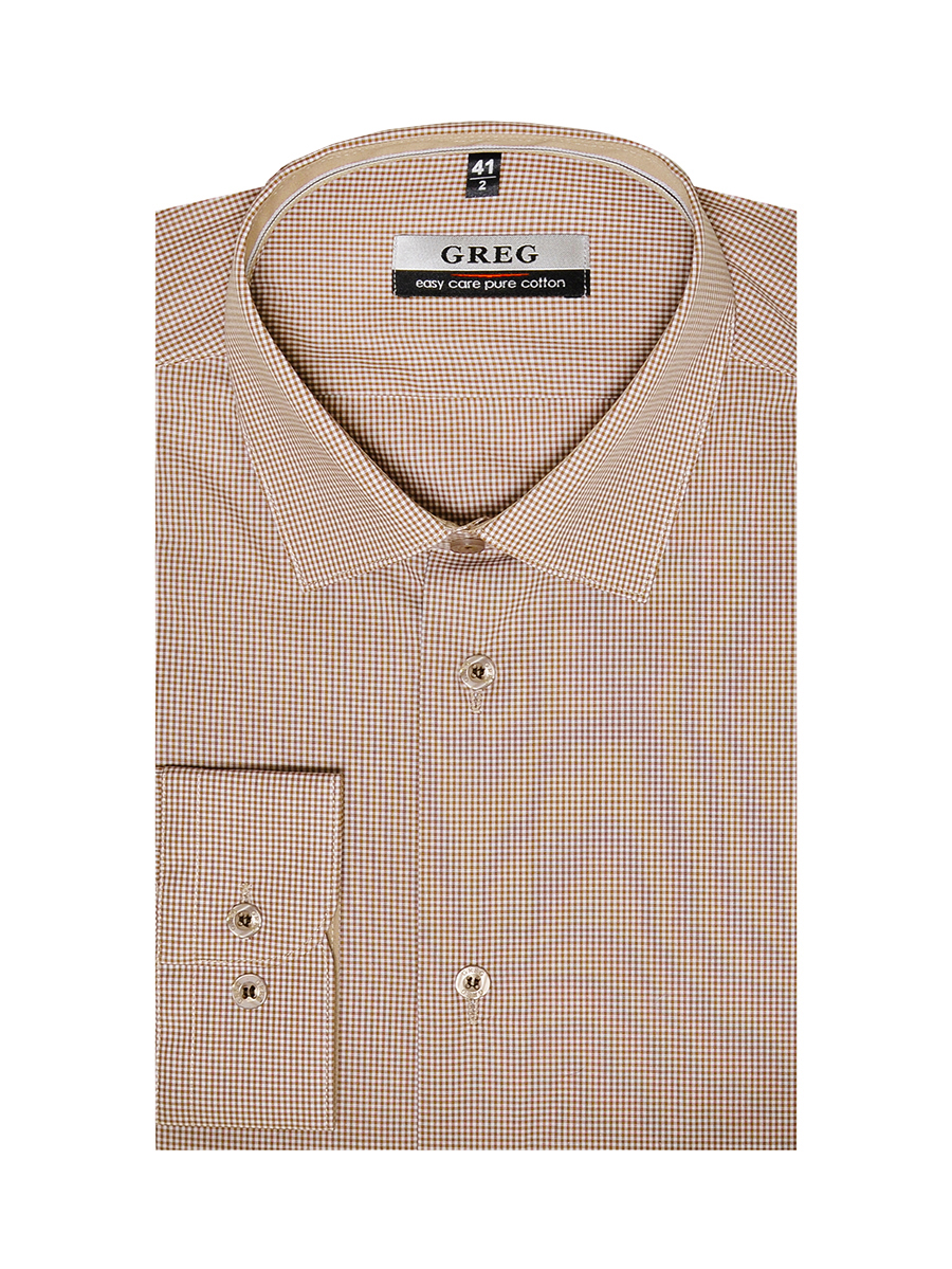 Цвет: Бежевый Рисунок: Клетка..показать> Состав: 100% хлопок Easy Care Модель: Зауженная Ворот: Немецкий Караман: отсутствует Манжет: классический закругленный на пуговицах 6 см Силуэт: Полуприталенный силуэт / Regular fit Отделка: Сорочки- внутренняя стойка воротника и внутренний манжет из ткани компаньона>